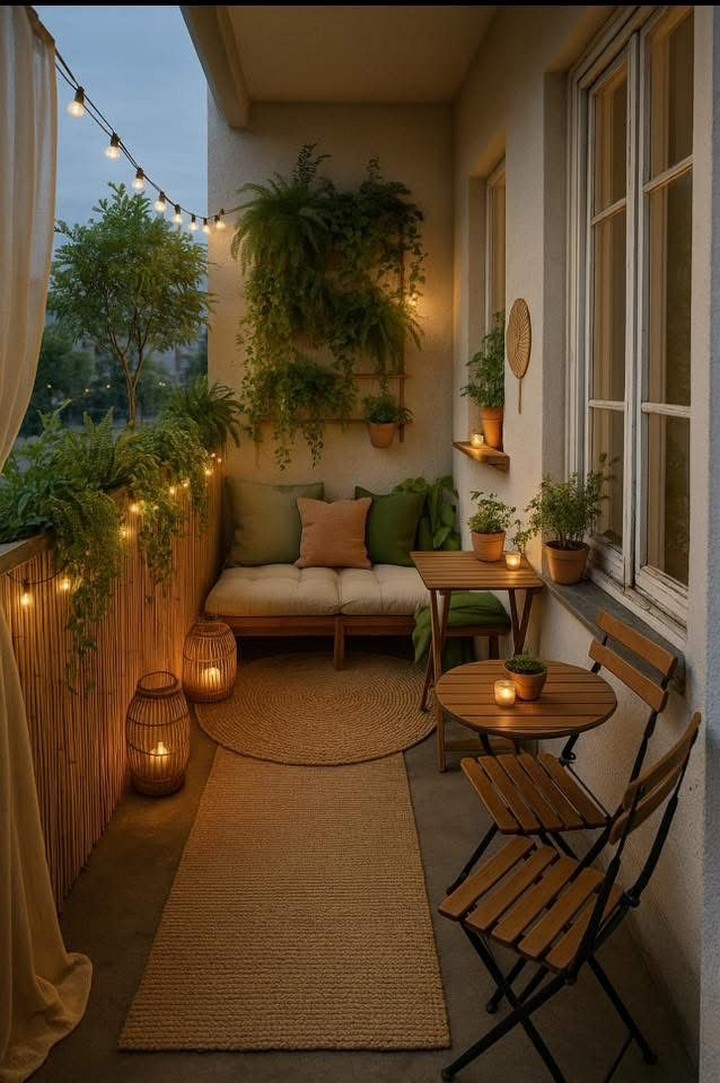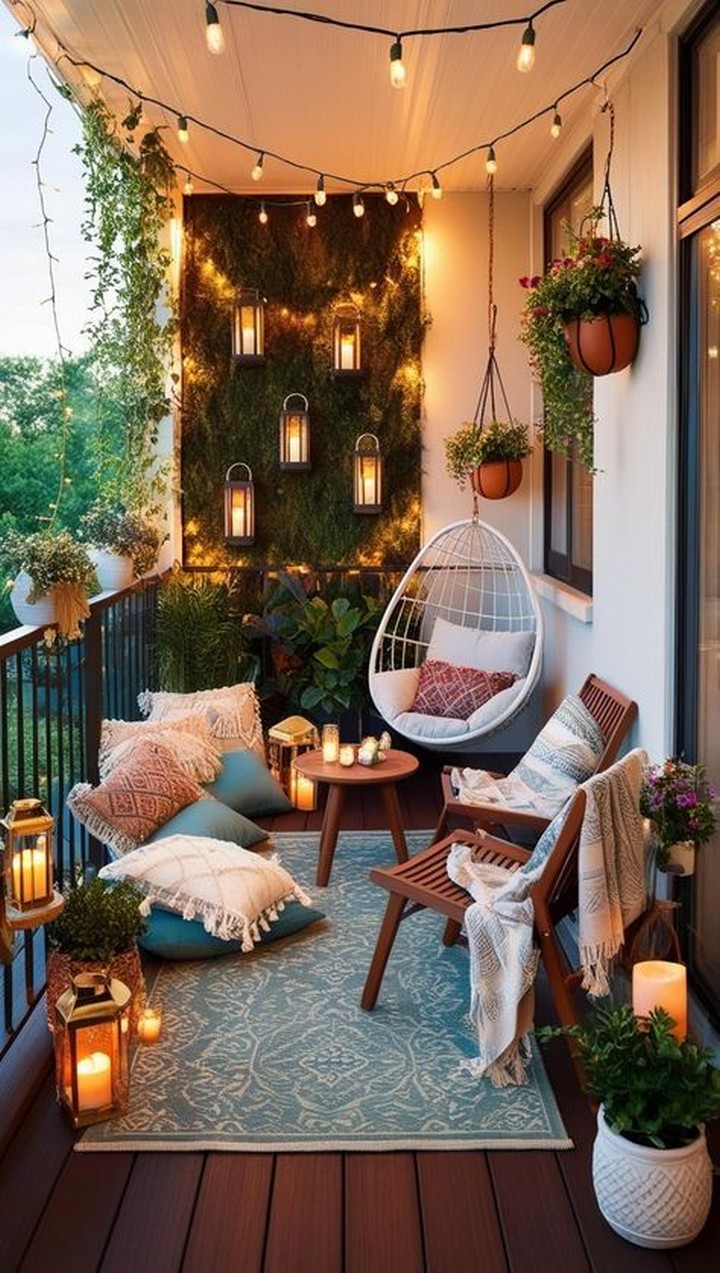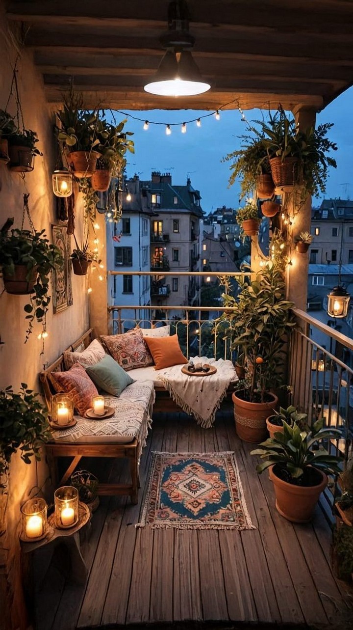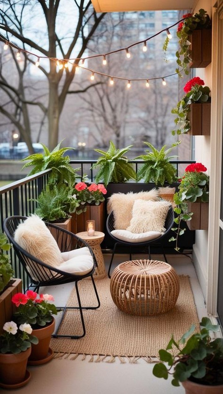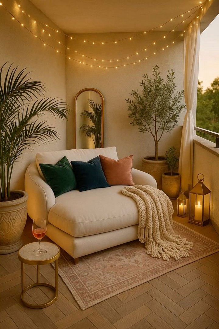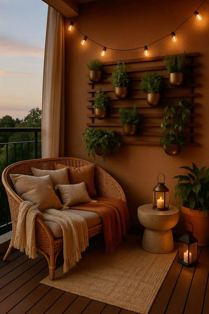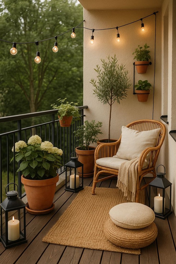 Fairy lights or globe string lights strung along balcony railings, overhead, or cascading through plants add a gentle, shimmering glow. Select warm hues like soft white or amber to intensify the inviting atmosphere.