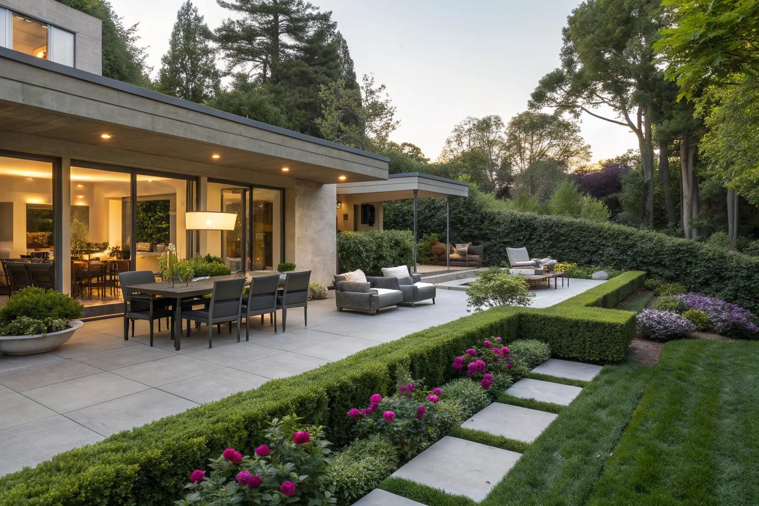 Design a multi-tiered patio that provides clear zoned spaces for different functions—like dining on one level and lounging on another—introducing architectural intrigue and functionality.