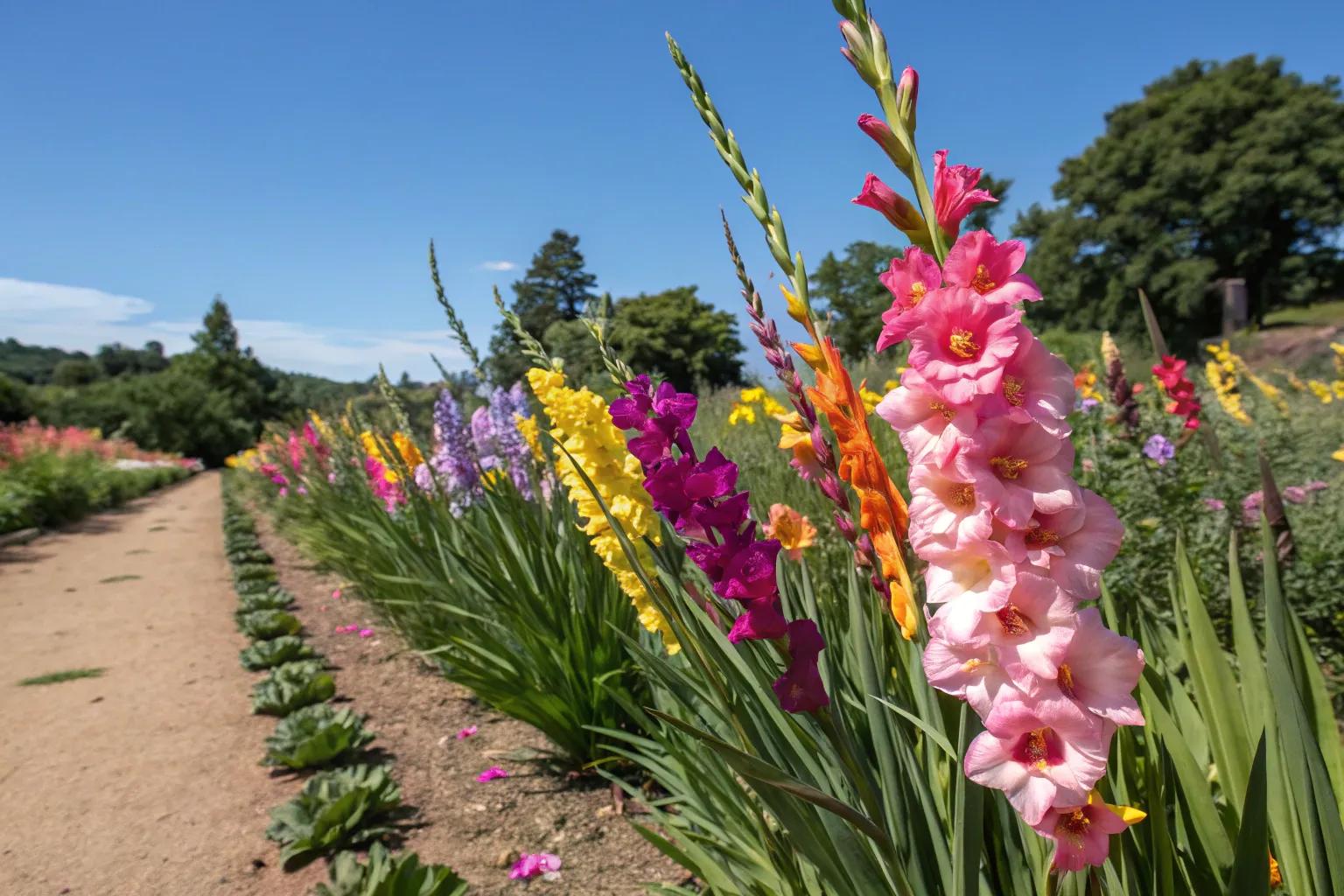 Arrange gladiolus in a continuous row to form an eye-catching flowering hedge. This approach combines functionality and beauty by marking spaces while showcasing their spectacular floral display.