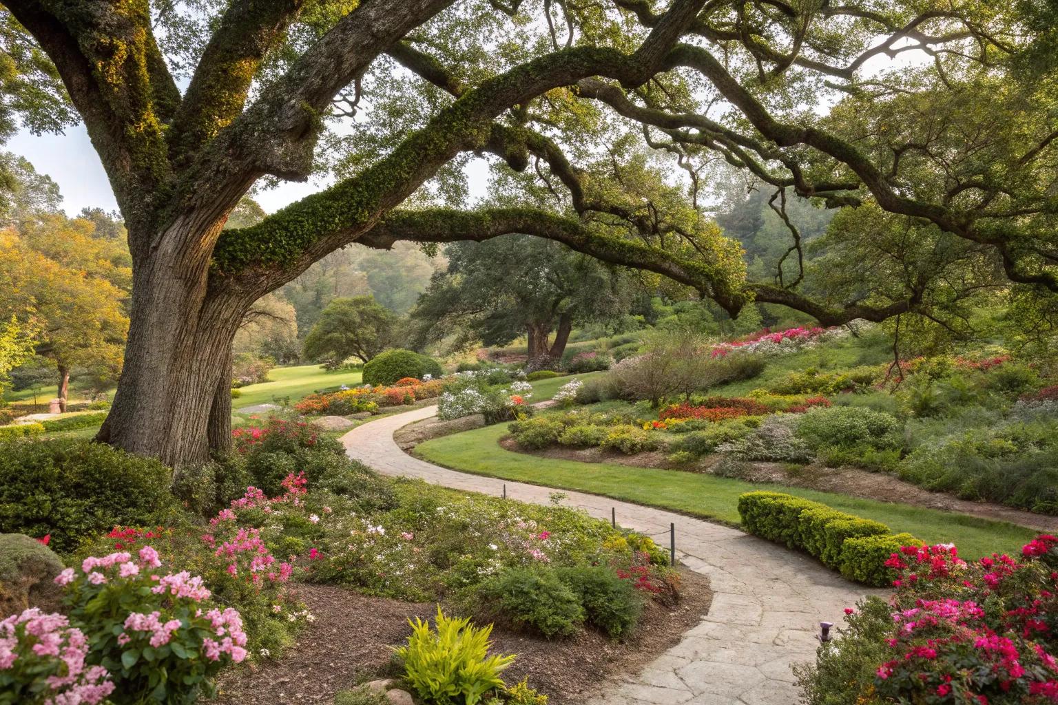 Using an array of stones and pebbles, a rock garden creates a low-maintenance, peaceful retreat beneath the oak. This enhances rustic charm while minimizing upkeep, ideal for drought-prone areas.