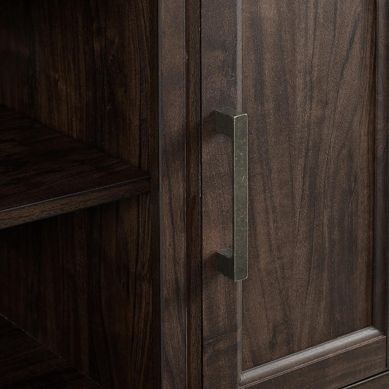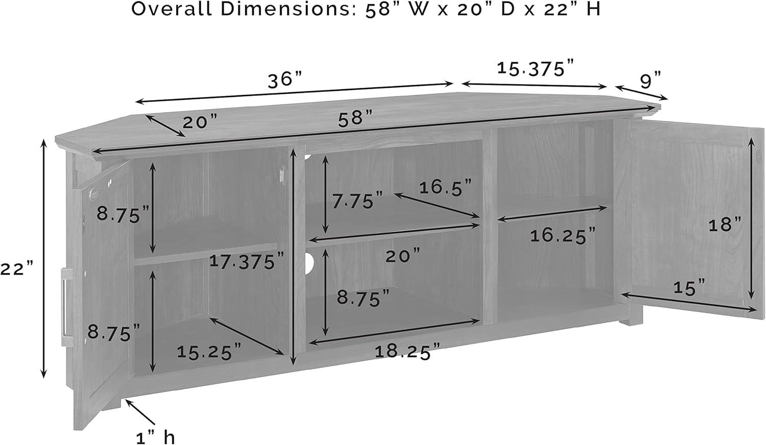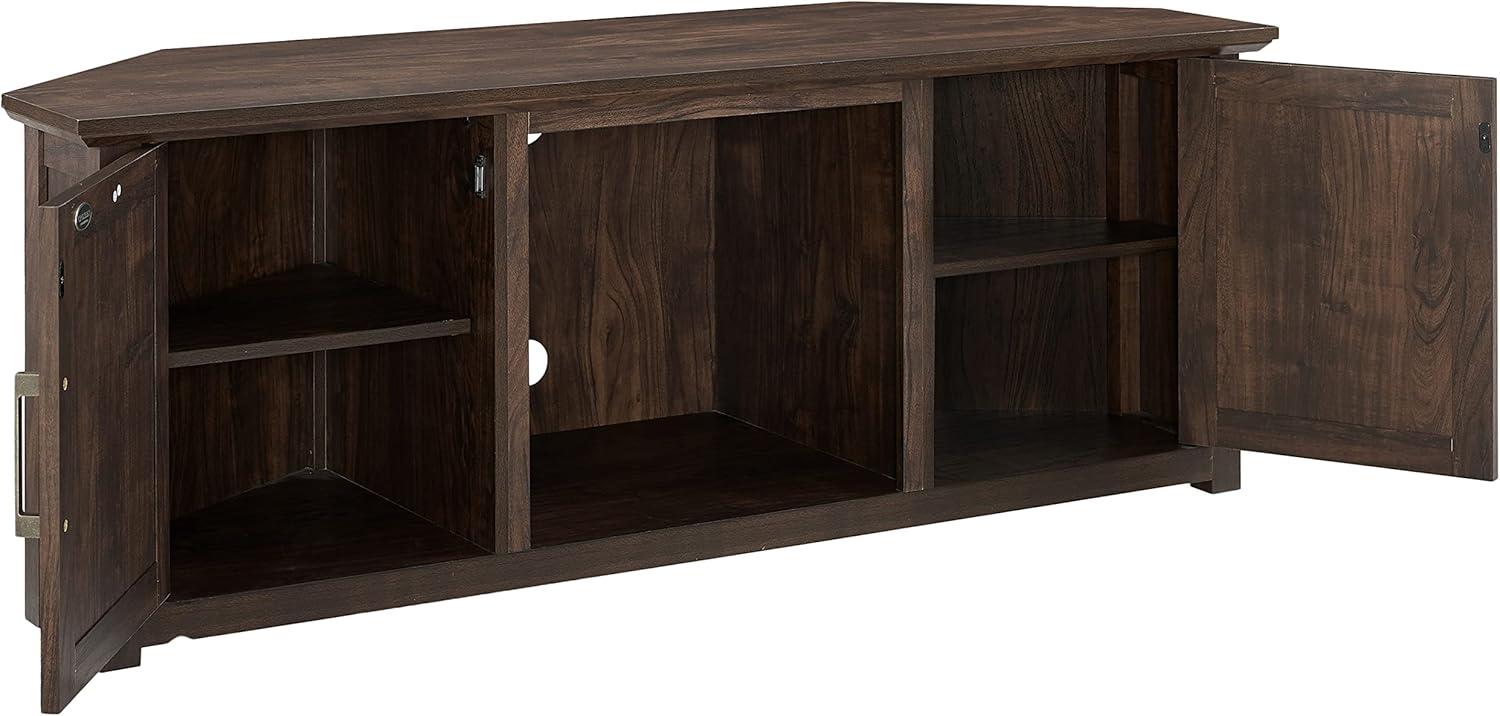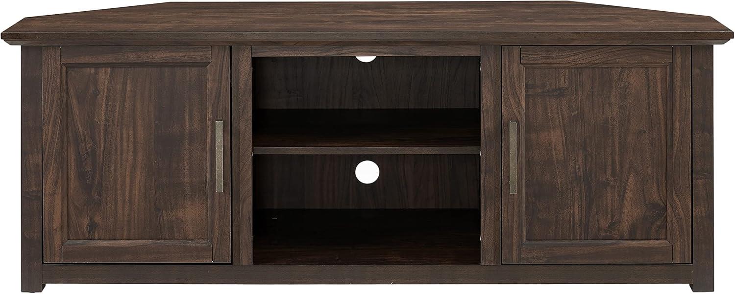 You notice the crosley Camden corner TV stand before you even look up at the screen — its dark walnut finish catches the late-afternoon light and the antique-brass pulls flash where your hand rests. Up close the wood-grain feels slightly embossed under your fingers, and the top has a reassuring weight; from the sofa it reads low and anchored, wide enough to balance a large flat screen without looking bulky. The open middle shelf and two side cabinets break the silhouette into practical planes, their shadowed interiors giving storage a quiet, domestic feel. Small details — the soft scrape of the cabinet doors and the neat cutouts at the back for cords — make it settle into the room rather than stand apart.