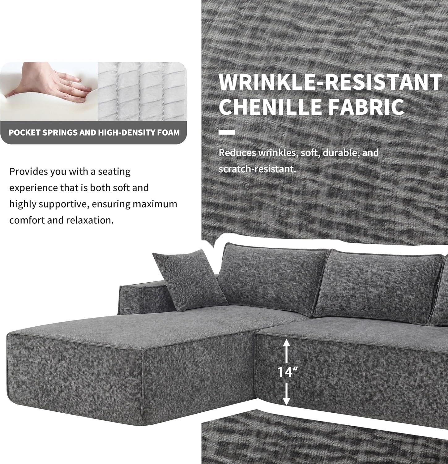 When you approach it for the first time, the piece reads as a compact L-shaped mass: clean edges break into visible seams where the modules meet, and the grey chenille shows a subtle nap that shifts as you move around it. Cushions appear plump at a glance, but when you press a palm into the seat the surface yields and molds, producing a quiet, fabric-on-fabric sound. the loose pillows sit casually against the back; they compress under your arm and then spring back, often needing a speedy pat to settle into place after someone gets up.