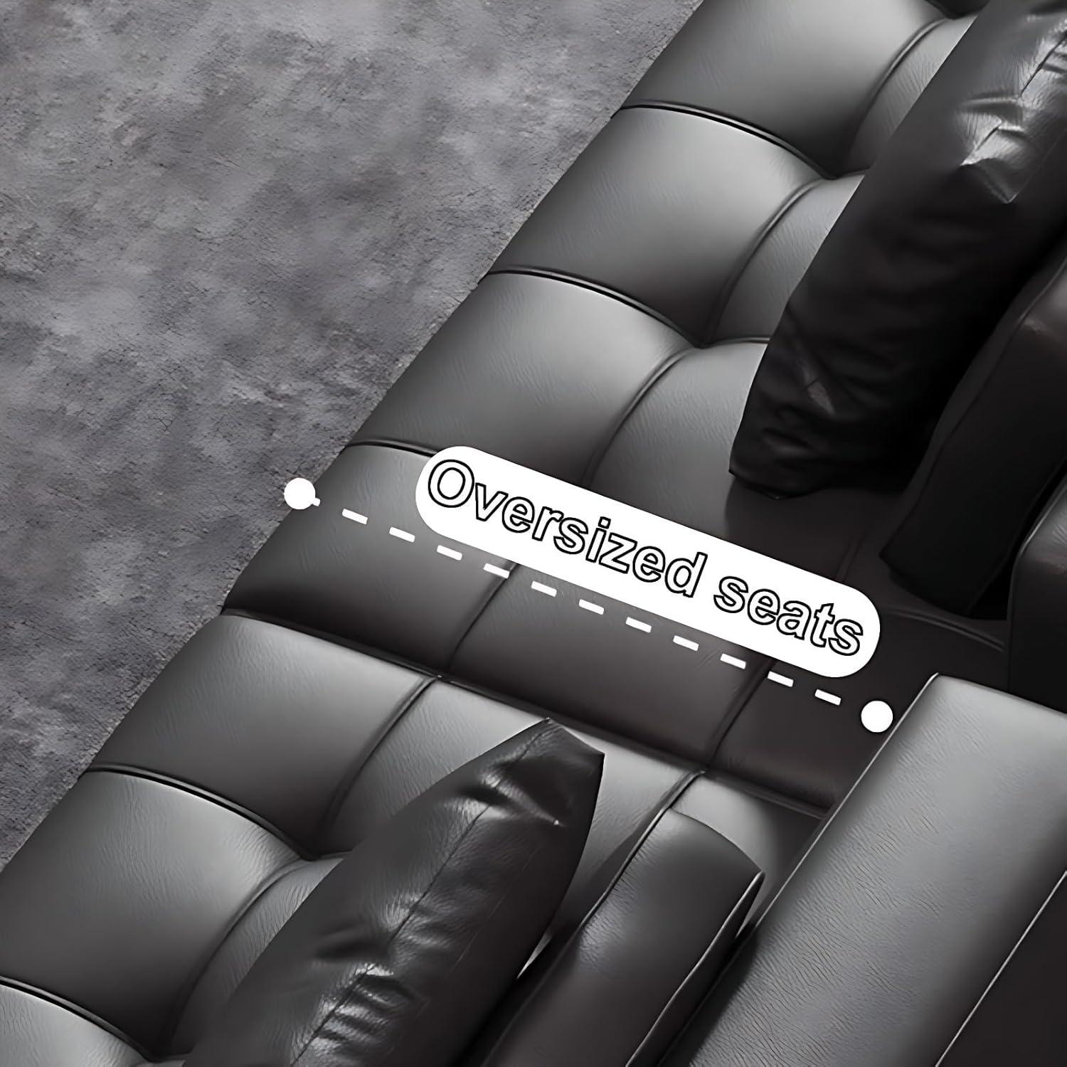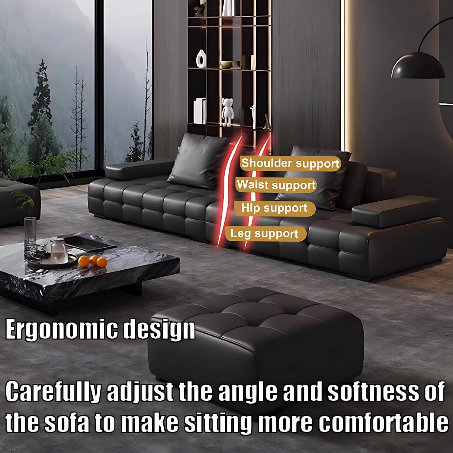 from the moment we saw this sectional, its sleek, modern design paired with the rich black leather immediately caught our attention. the couch boasts an oversized seating area complemented by luxuriously thick cushions and a high backrest, making it an inviting spot for deep relaxation or lively gatherings. What truly sets it apart is the scientifically engineered four-zone curved design, which aligns perfectly with the body’s natural contours-providing exceptional ergonomic support that eases tension from back to legs.The craftsmanship of the solid wood frame stood out as well, promising robust durability without any wobble or warping over time.