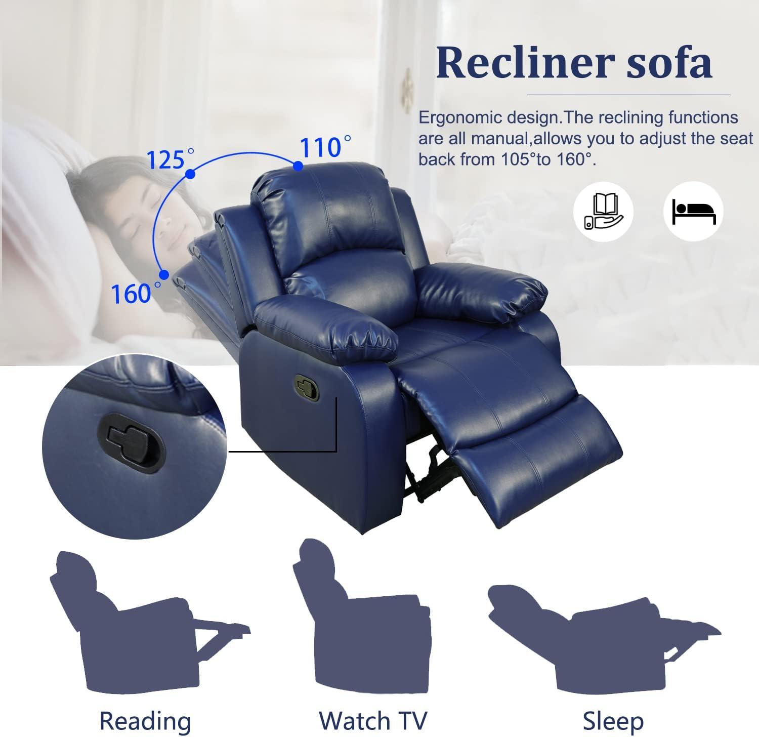 | Elegant Blue Leather Upholstery Adds a Touch of Sophistication | Manual Recliner Mechanism Requires Physical effort |