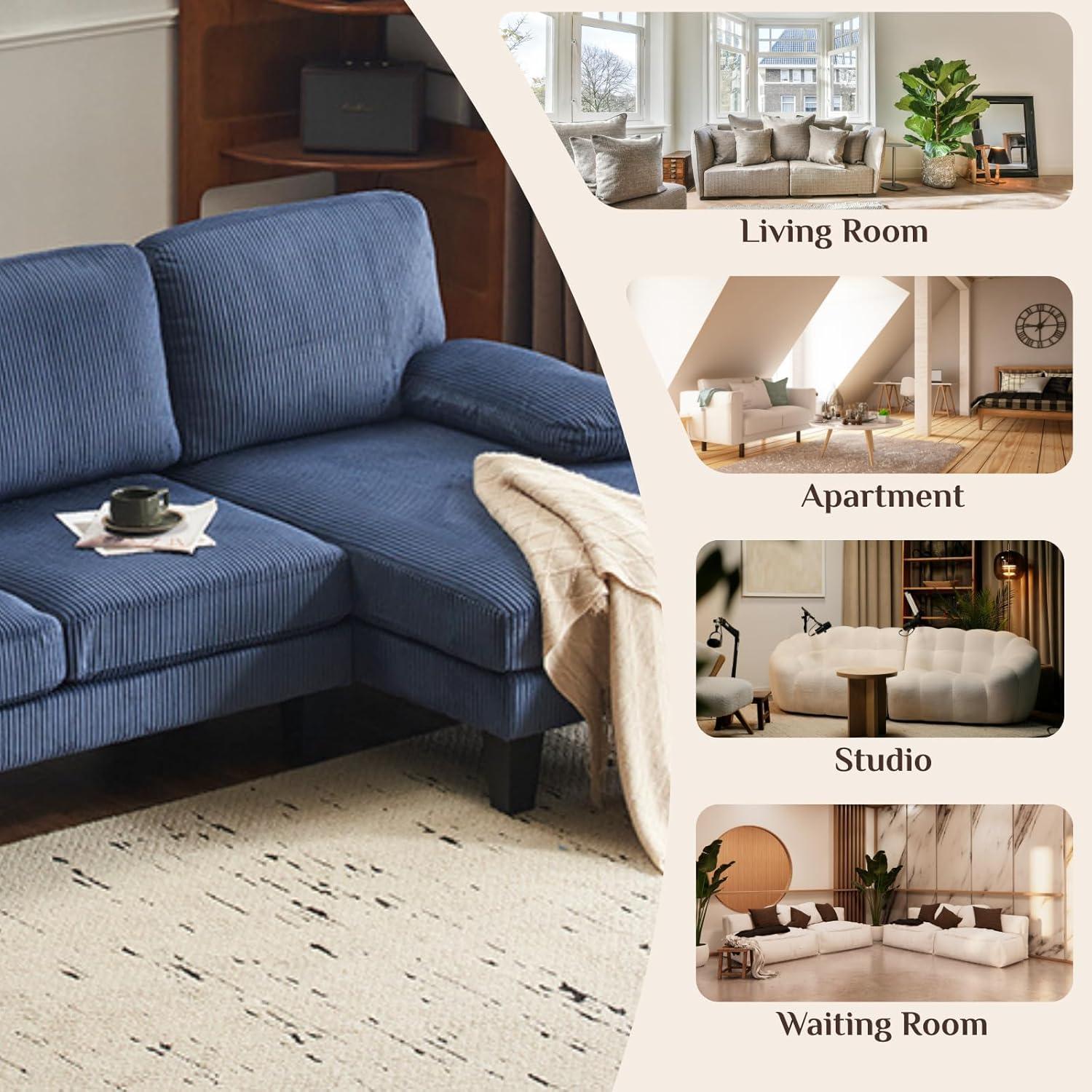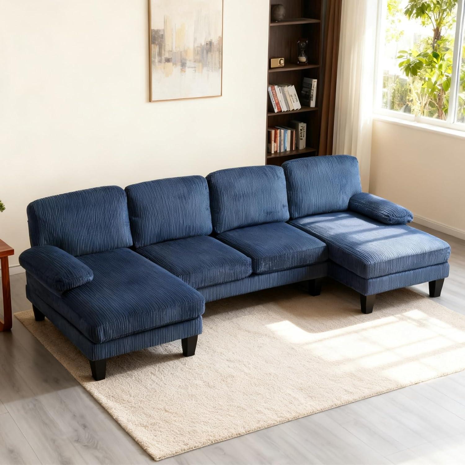 From the moment we unpacked this U-shaped sectional, it was clear that it was designed with both style and comfort in mind. the rich navy blue corduroy upholstery exudes a cozy yet sophisticated vibe, perfectly complementing the natural warmth of the wood grain legs. The spacious layout comfortably seats four, with inviting chaises on either side that encourage lounging and relaxation.The balance between plush cushioning and firm support felt immediately apparent, making it an ideal spot not only for watching TV or gaming but also for afternoon naps and reading sessions.
