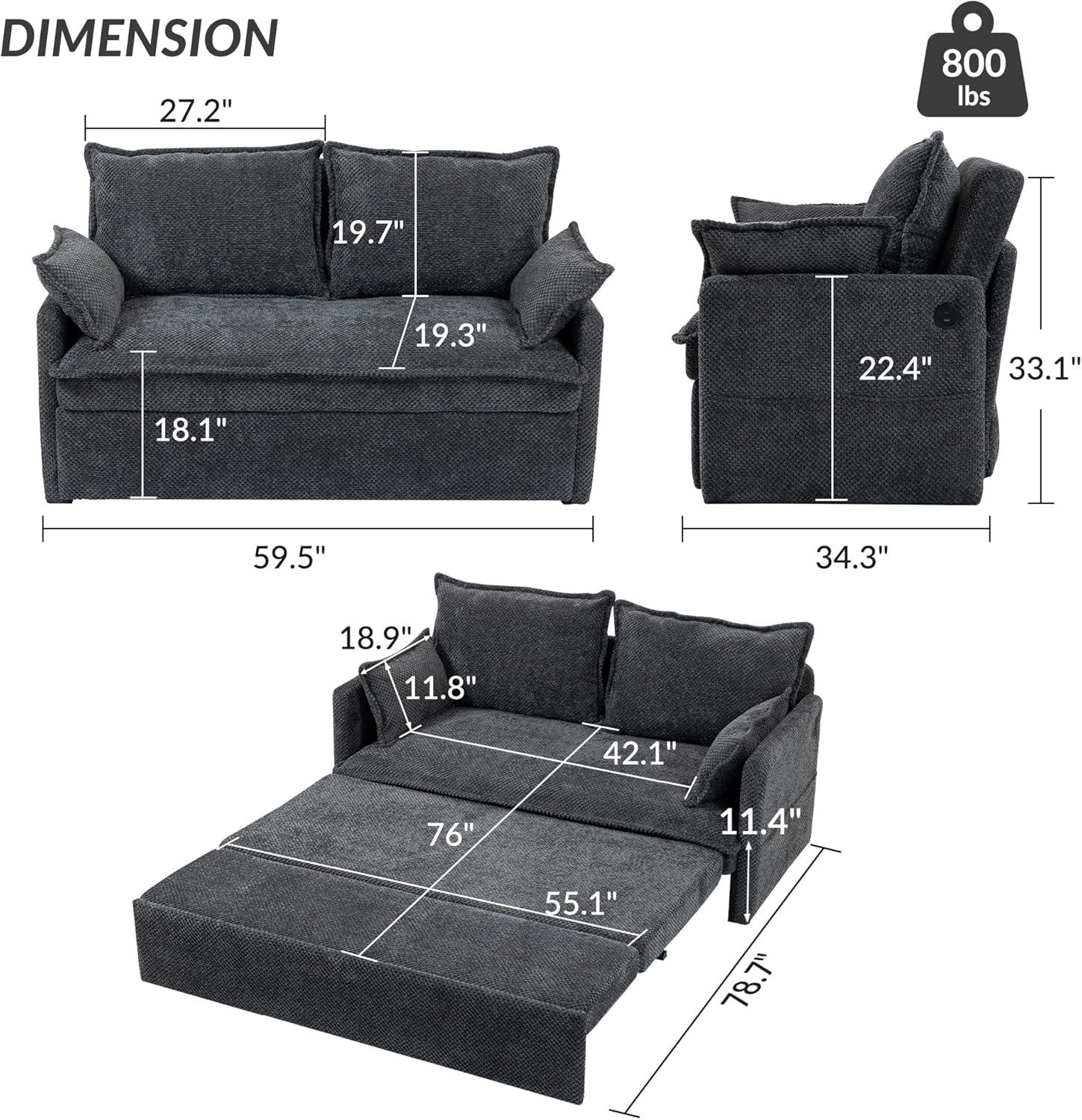Transforming it into a bed is a smooth experience thanks to the noise-free rollers under the base. The pull-out mechanism slides effortlessly, revealing a queen-sized sleeper measuring 55.1″ by 76″ – ample room for two adults to rest comfortably. The stabilizing legs lock securely into place, providing excellent support and stability for up to 500 pounds. We’ve found the integrated side pockets and dual USB/Type-C charging ports especially handy during setup and nightly use, keeping essentials close and devices powered without any clutter.