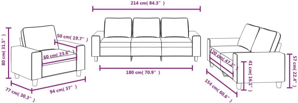 Designed for versatility, the three-piece layout includes a sofa chair, a two-seater, and a three-seater sofa, allowing us to arrange the pieces flexibly to best fit our living space. Assembly is straightforward, aided by clear instructions and all necessary components included in the package. Below is a quick glance at the dimension details for each piece: