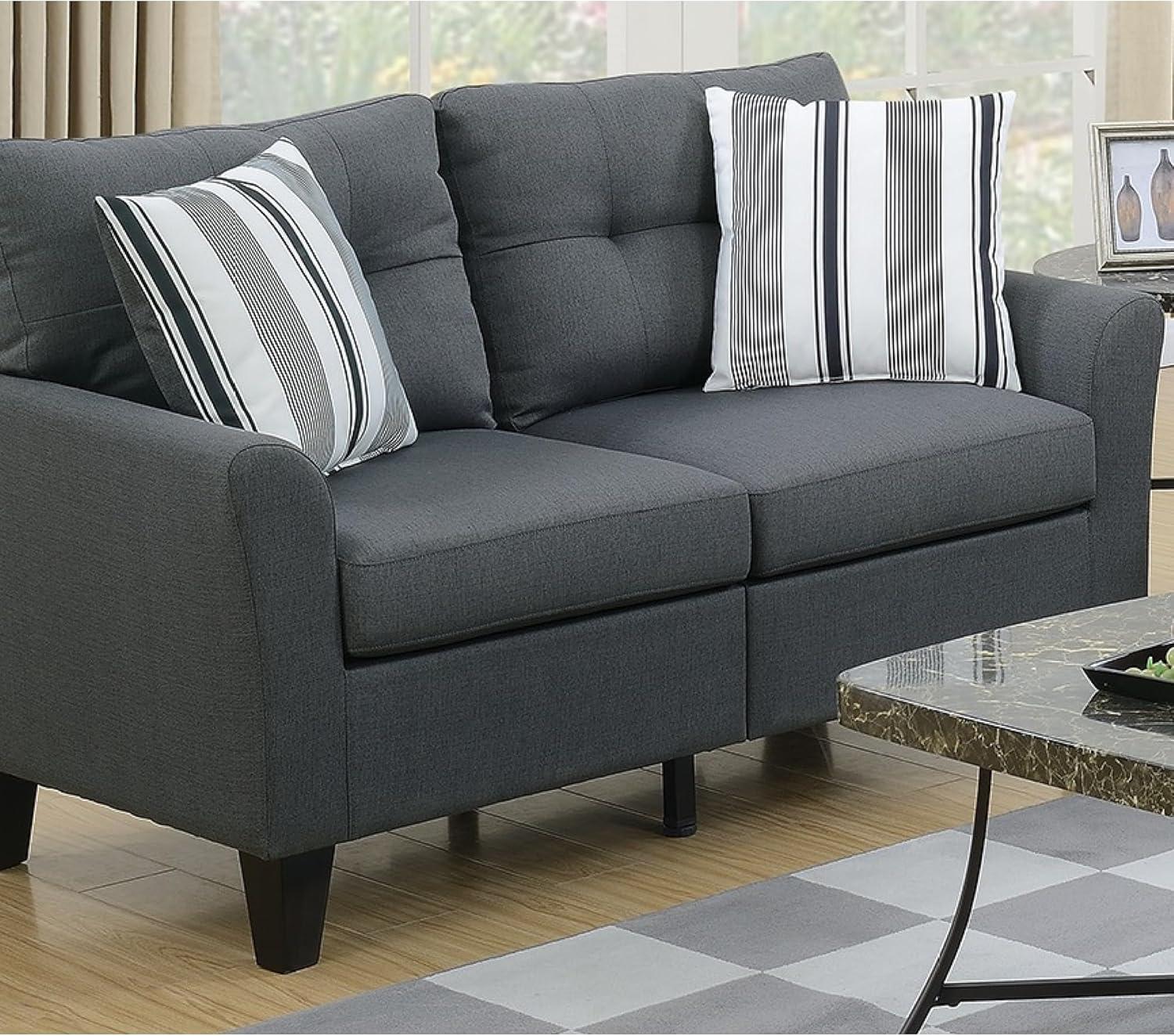 we found this 2-piece set to be an excellent balance between style and durability. Crafted with a solid pine frame and a sturdy plywood base, both the sofa and loveseat feel incredibly robust while maintaining a sleek profile. The charcoal glossy polyfiber fabric adds a modern touch without sacrificing comfort, complemented perfectly by the contrasting accent pillows that bring just the right amount of visual interest. With dimensions perfectly suited for most living spaces, this duo offers cozy seating without overwhelming your room.