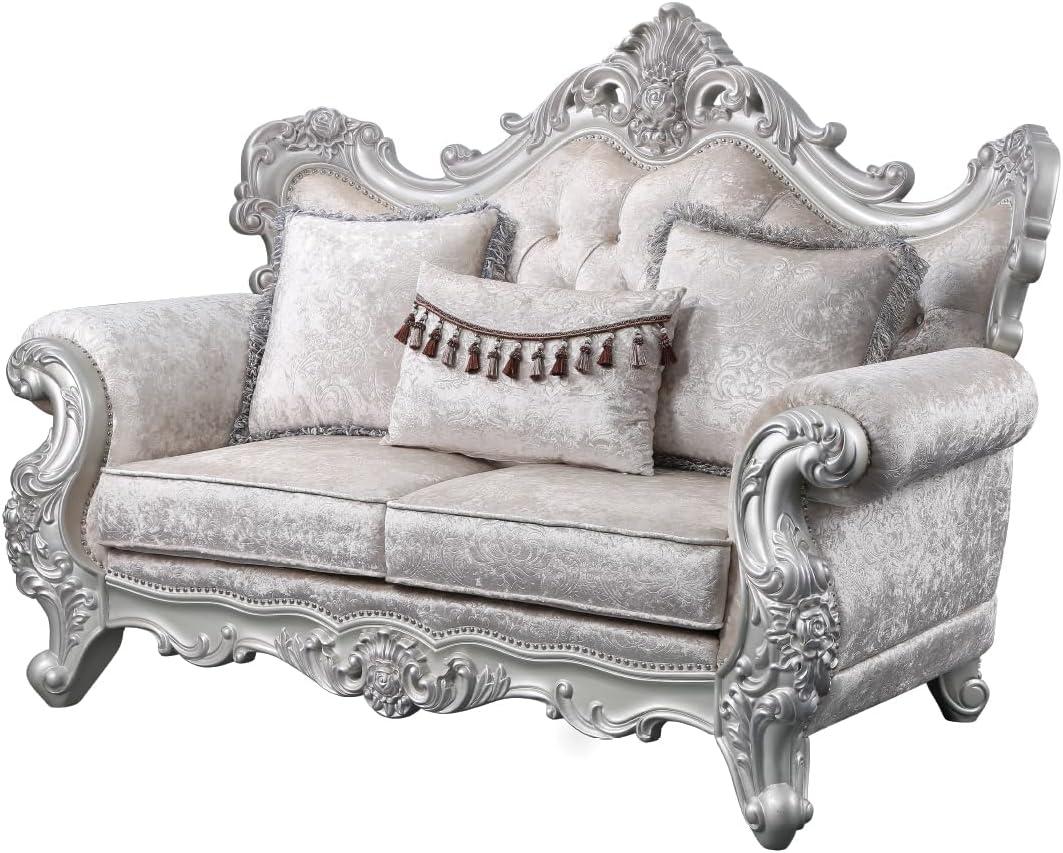 This set brings a refined charm that effortlessly bridges classic and contemporary interiors.Its durable wood construction and elegant silver brush finish introduce subtle sophistication, making it a perfect match whether your living space leans towards vintage warmth or modern minimalism. The plush cushions invite relaxation, complementing both cozy traditional rooms adorned with warm tones and more muted, monochromatic settings that value sleek simplicity.