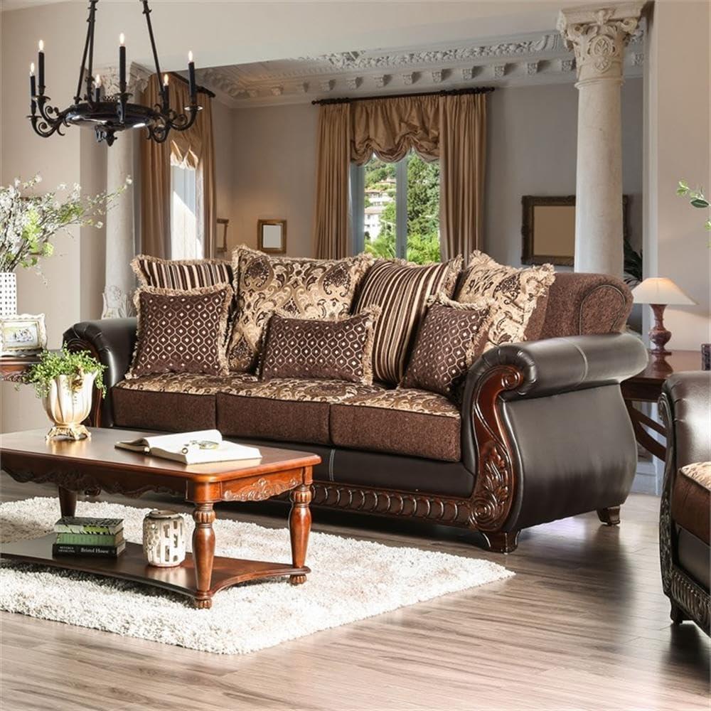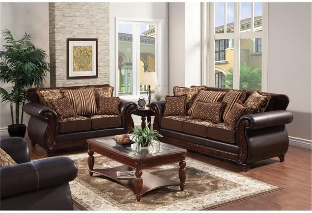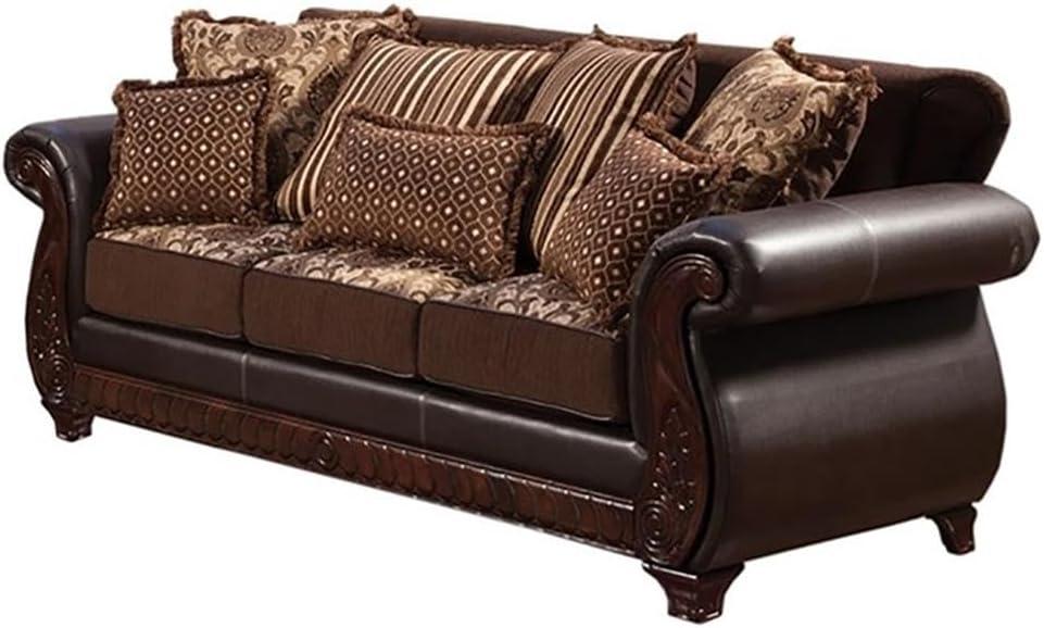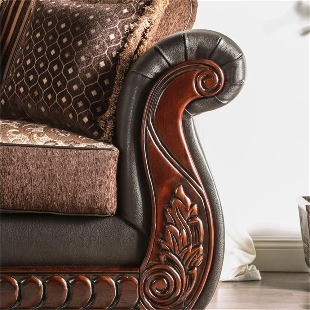 We find that the rich dark brown faux leather on this set strikes a perfect balance between classic elegance and modern durability. The upholstery is not only visually appealing but also impressively soft to the touch, inviting us to unwind in comfort. The rolled arms, cushioned with extra padding, add a timeless charm while providing practical comfort. Complemented by solid wood frames with delicate floral engravings, the design exhibits a level of craftsmanship that elevates the entire living space. This interplay of textures and details creates a cohesive look that feels both warm and sophisticated.