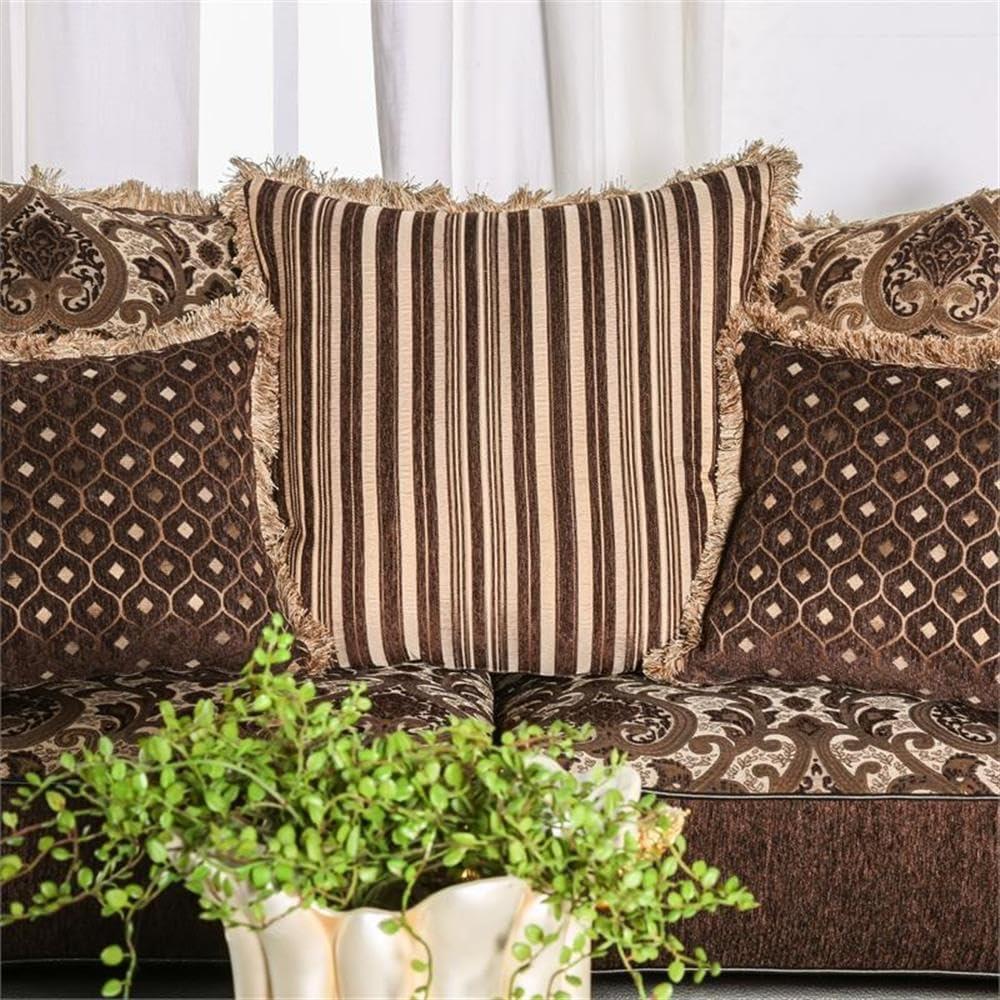 The fabric’s intricate patterns extend beyond the cushions to the accent pillows, tying the whole aesthetic together with understated artistry. The traditional styling is versatile enough to blend seamlessly with various décor themes, while the dark brown finish lends a versatile warmth that makes it a centerpiece in any room. Its harmonious proportions and ergonomic seat dimensions ensure both style and comfort are prioritized. Below is a quick overview of its standout design features: