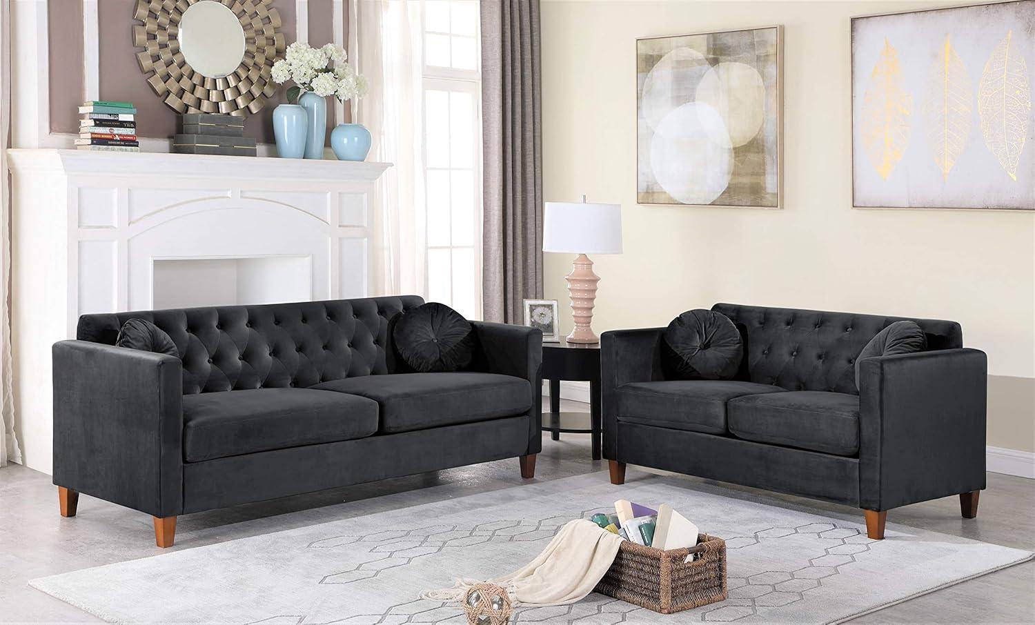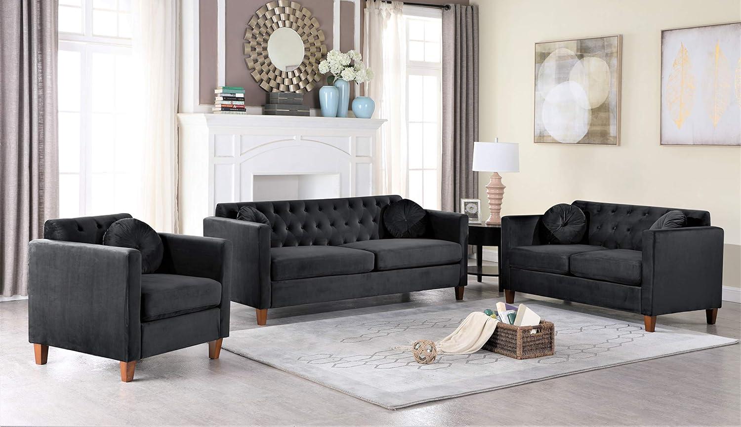 From the moment we saw this set,its classic Chesterfield design instantly caught our eye. The midnight black crushed velvet upholstery gives off an air of timeless elegance,combining sophistication with a cozy,inviting vibe. Each piece feels meticulously crafted, resting on finished wooden legs that enhance its refined aesthetic.Perfectly sized for a variety of spaces-including homes, apartments, and even offices-the trio comprises a sofa, loveseat, and chair that fit harmoniously into different room layouts without overwhelming the space.