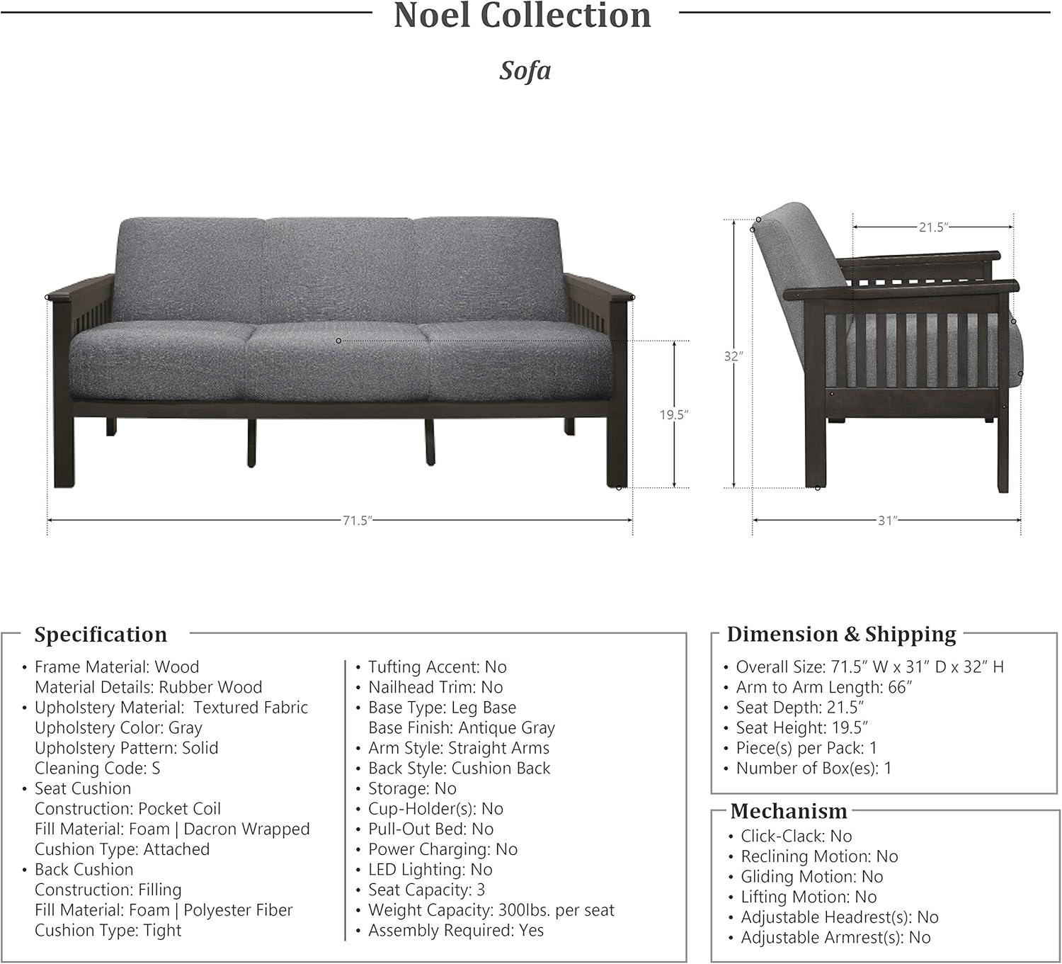 The soft, antique gray finish paired with the gray linen-like upholstery creates a wonderfully neutral base that harmonizes effortlessly with different design styles.Whether your space leans toward the warmth of rustic farmhouse, the clean lines of modern minimalism, or even a cozy transitional setting, this sofa set adapts like a chameleon. Its muted hues provide subtle contrast without overwhelming, allowing both vibrant accent pieces and muted wall tones to shine. The craftsmanship of the wood frame with its antique finish adds a touch of character, making it compatible with both traditional and contemporary décor elements.