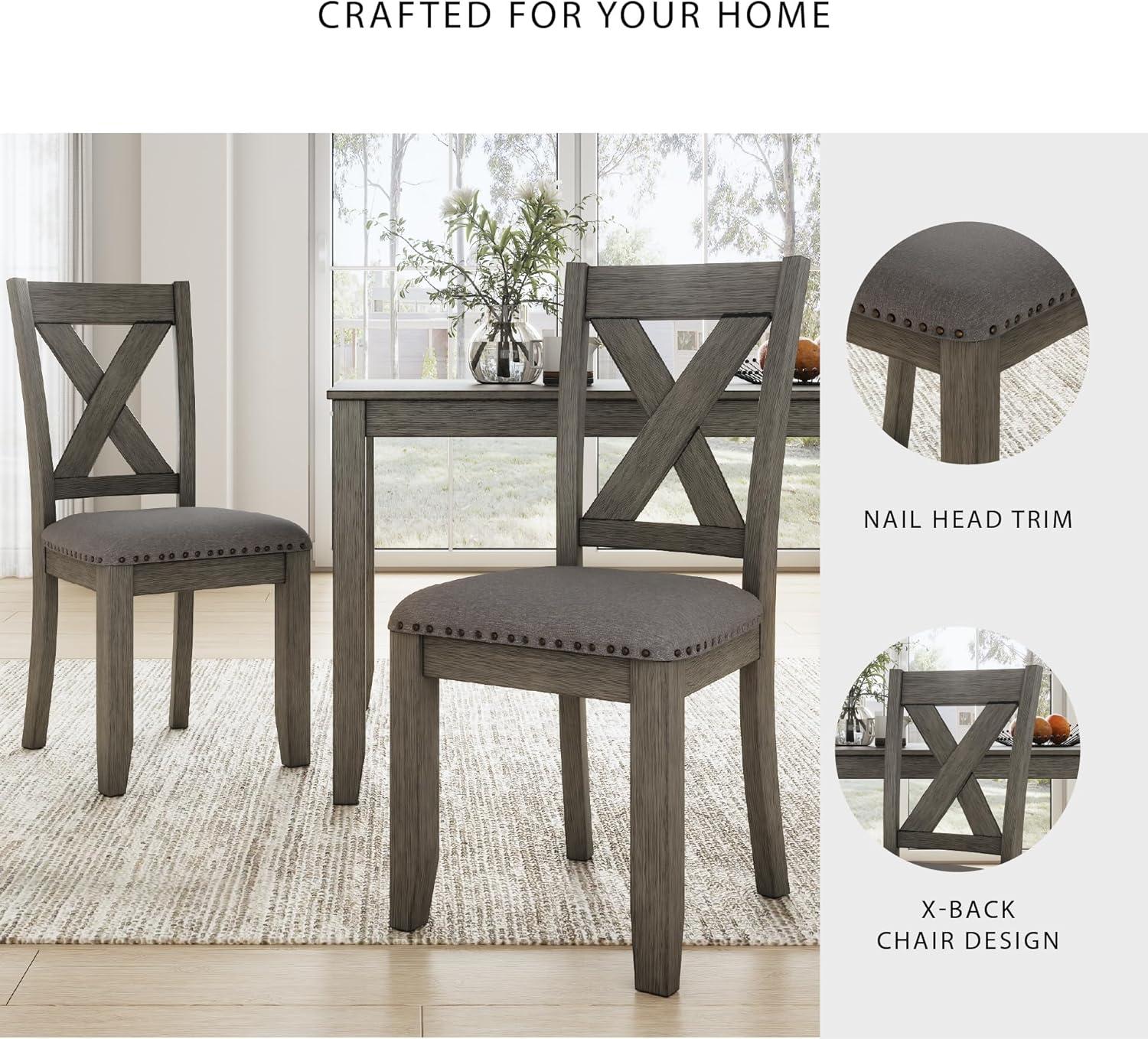 This dining set effortlessly balances rustic charm with modern simplicity, featuring a subtle gray wash that complements a variety of interior styles. The clean lines of the rectangular table paired with the six X-back chairs create a cozy yet complex atmosphere perfect for family meals or entertaining guests. Each chair is upholstered in soft, textured gray polyester fabric, enhanced with tasteful nailhead trim that adds a touch of elegance without overwhelming the casual vibe.