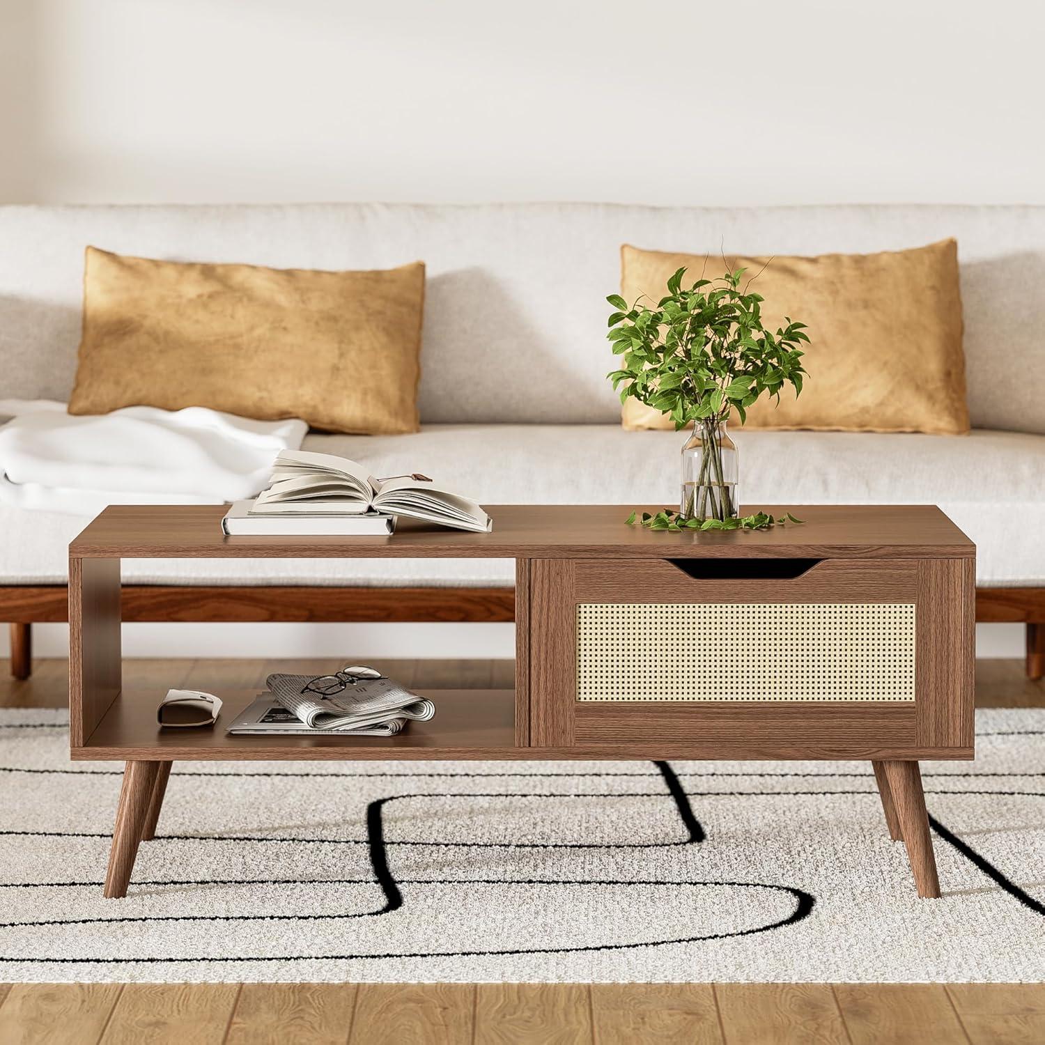 Living with the Brown Rattan Coffee Table, Mid century Modern with Drawer & Shelf, 39” Wooden boho Coffee Table for Living room feels less like an introduction and more like a slow settling, noticed in small, repeated ways over time. In daily routines it becomes the spot for a morning mug, a dropped remote, the soft weight of a book left open, the surface gathering faint marks that map ordinary use. As the room is used you become aware of how its proportions shape reaching and resting, how the drawer and shelf take on casual tasks and habits. After months of regular household rhythms it stays,blending into everyday rhythms.