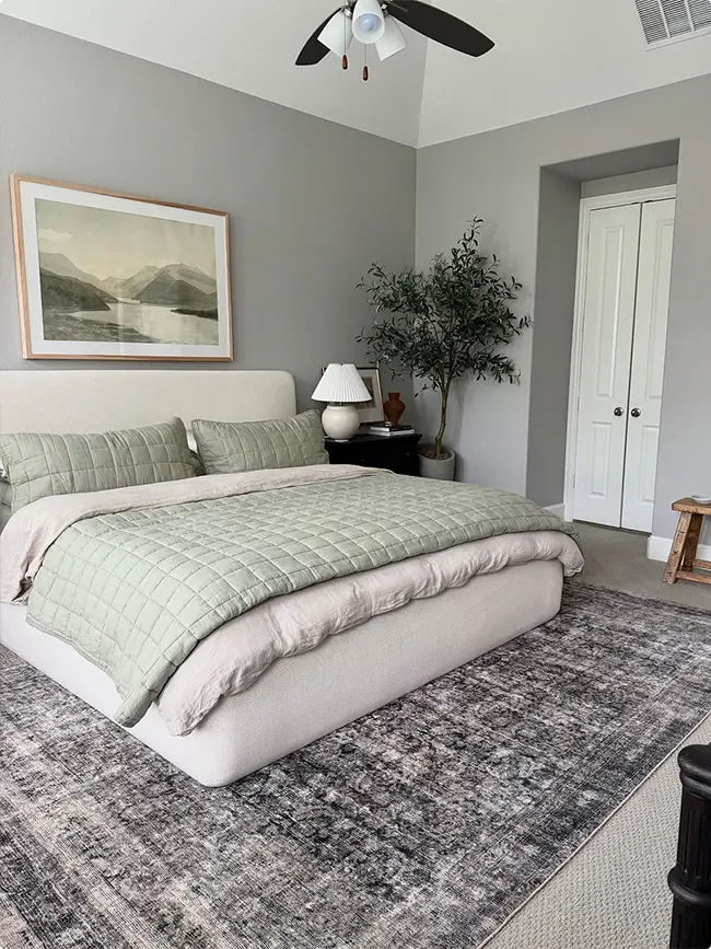 A set of sage pillows sits elegantly against a light gray headboard, contributing to a subtle, serene spring palette.