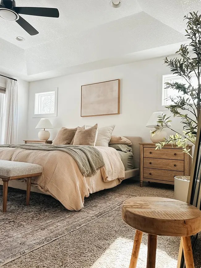 Layering various textures in warm neutrals—think camel, cream, and soft brown—keeps this bed far from monotonous.