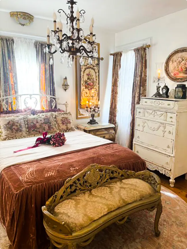 Rich brown hues merge with floral pillows and a striking chandelier to deliver old-world charm, while the velvet bench at the foot adds a luxurious touch.