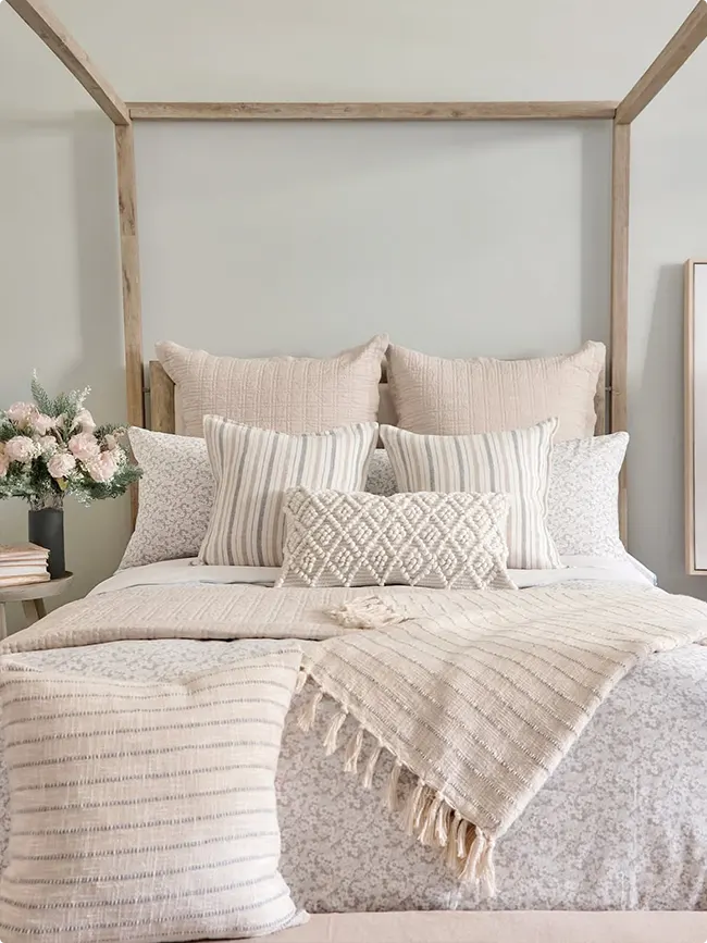 A light wood canopy frame introduces subtle drama without heaviness, framing a bedding setup focused on texture—from striped pillows to tufted accents—all within a neutral color scheme.