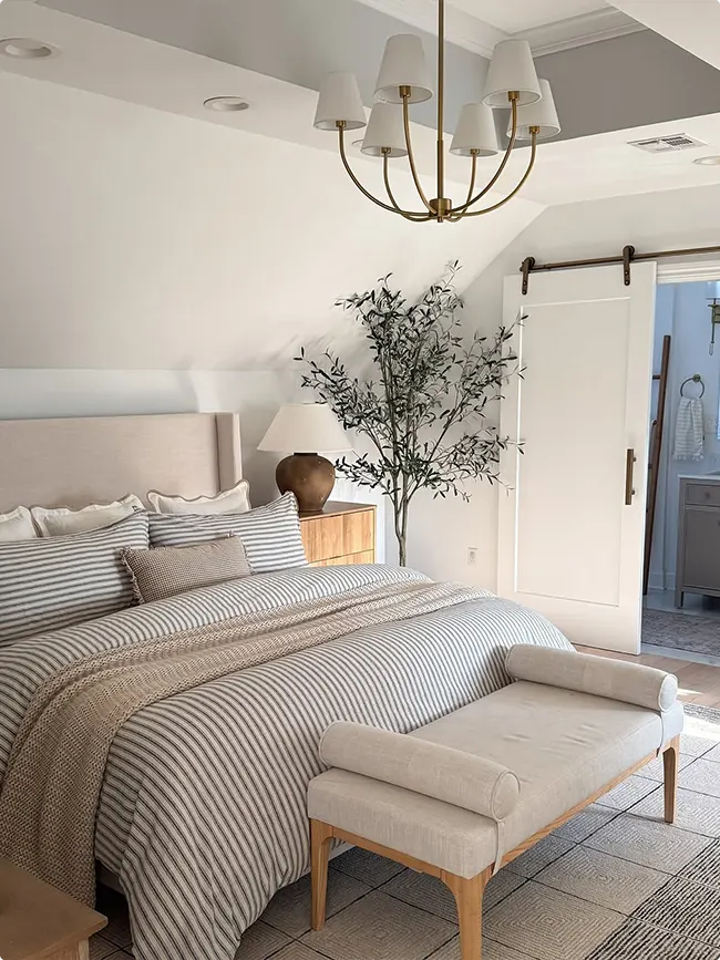 A quilted duvet paired with plush pillows invites comfort, while a flourishing olive tree adds a refreshingly organic vibe.