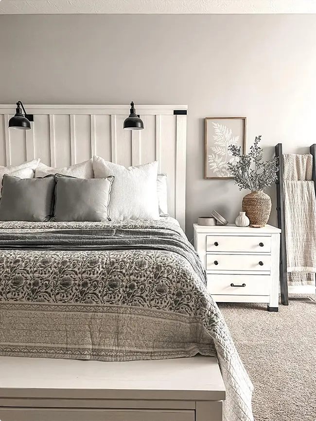 The vertical paneled headboard paired with modern black sconce lighting provides a chic framework to the inviting bedding ensemble.