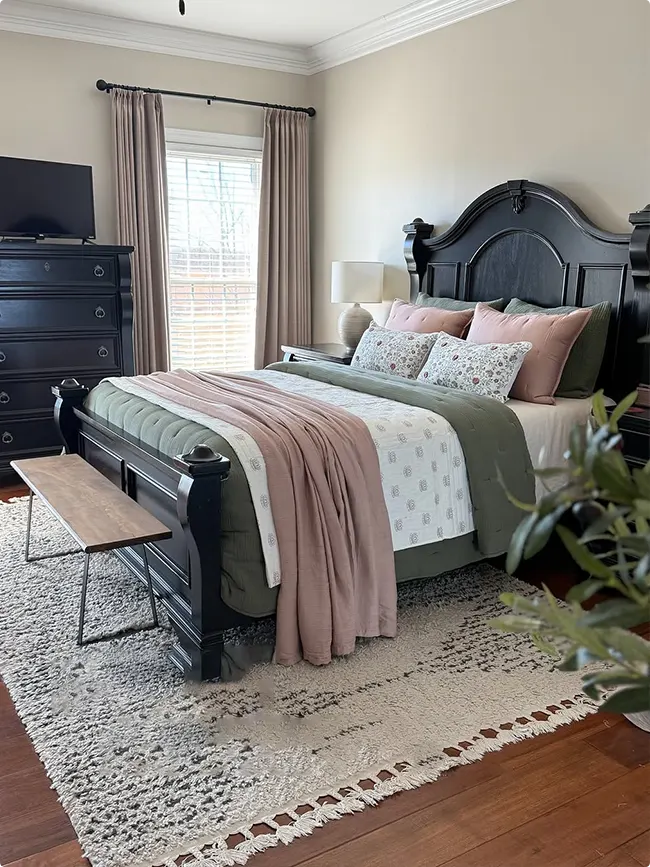This setup uses sage, blush, and white layers to soften the heaviness of the bed frame without matching too much.