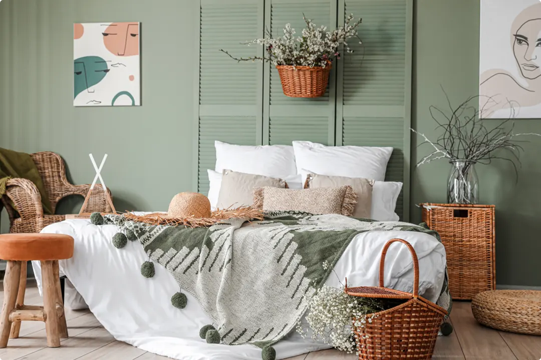 Earthy Sage Walls Complemented by Natural Woven Textures