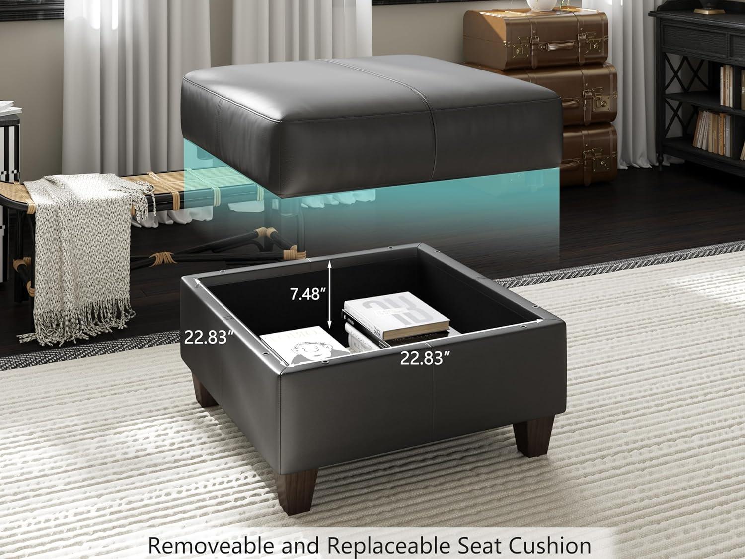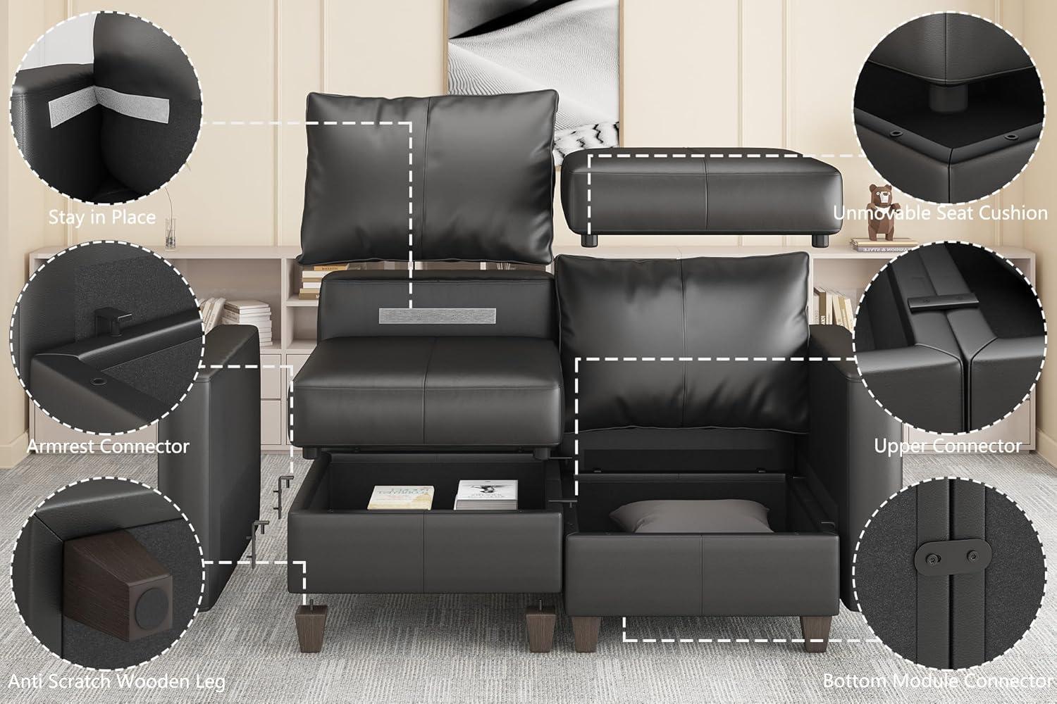 Sunlight skimming the black surface makes the EASE MOOSE Faux Leather Modular Sofa Sectional Couch with Storage read less like vinyl and more like a muted leather presence in the room. Up close you notice a cool, smooth give under your palm and the faint grain of the upholstery, while the seams and hidden hinges quietly promise storage where the cushions lift. The U-shaped mass reshapes the room’s scale—the armrests feel unexpectedly broad, the seats sit on springs that push back just enough, and the whole setup has a grounded, slightly solemn visual weight. Small lived-in details stand out: cushions that click into place,a low-profile back that doesn’t overwhelm,and edges that catch the light differently as you move around it.