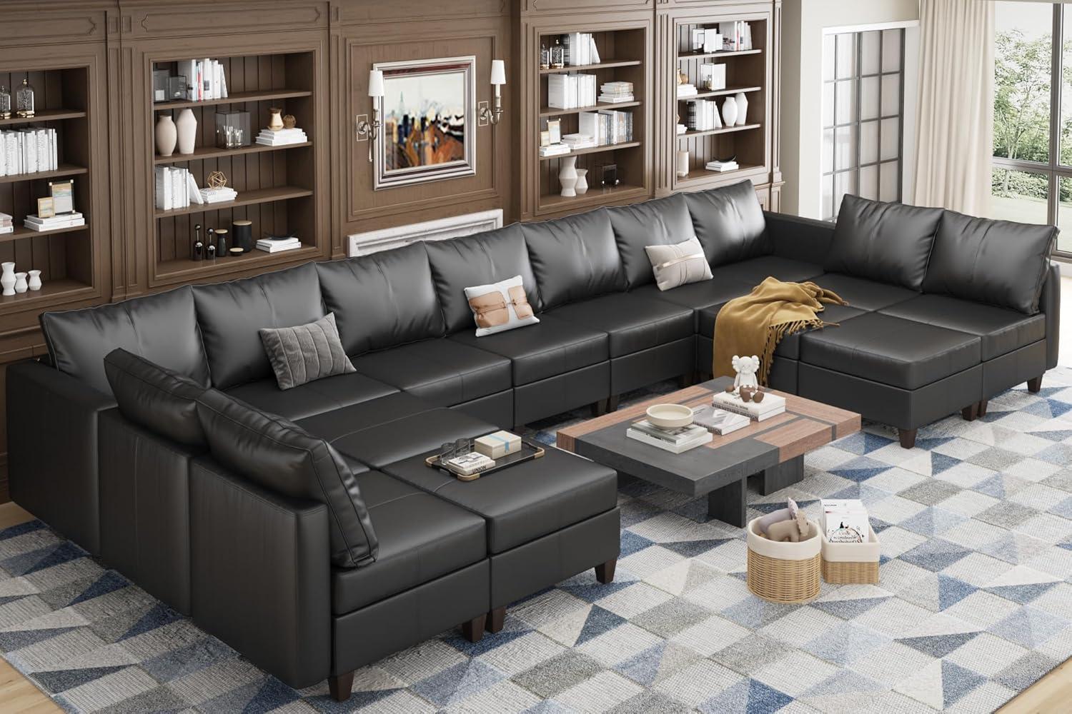 When you first see the U-shaped sectional in black, it reads as a solid, room-defining presence. The faux-leather surface catches light in a soft, satin way so highlights and shadows trace the cushions and seams; from a few steps away the finish looks uniform, but up close you notice stitch lines and panel joins that mark where the modules meet. The overall silhouette is low and broad; the armrests present as wide, flat planes and the chaises break the run of seats into resting places that invite you to step closer and touch.