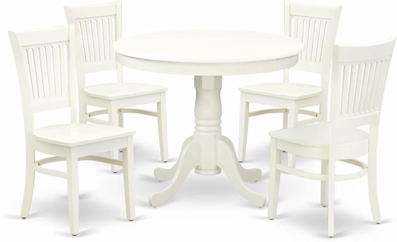 In my dining nook sits the East West Furniture Antique 5-Piece Dining Table Slatted Chairs in Linen White — or, more simply, East west’s linen-white round set. Sunlight skims the circular top and you notice a soft, muted sheen rather than a slick lacquer; the linen paint lets the wood’s faint grain and brush marks peek through. Run your hand along the edge and ther’s a subtle tooth too the finish, while the pedestal feels reassuringly solid under an elbow. The slatted chair backs throw thin, vertical shadows across the seats, whose wooden surfaces have a firm, lived-in give. From across the room it reads as a modest, measured presence — quiet joinery and even proportions, nothing ornate, just an unassuming practical weight.