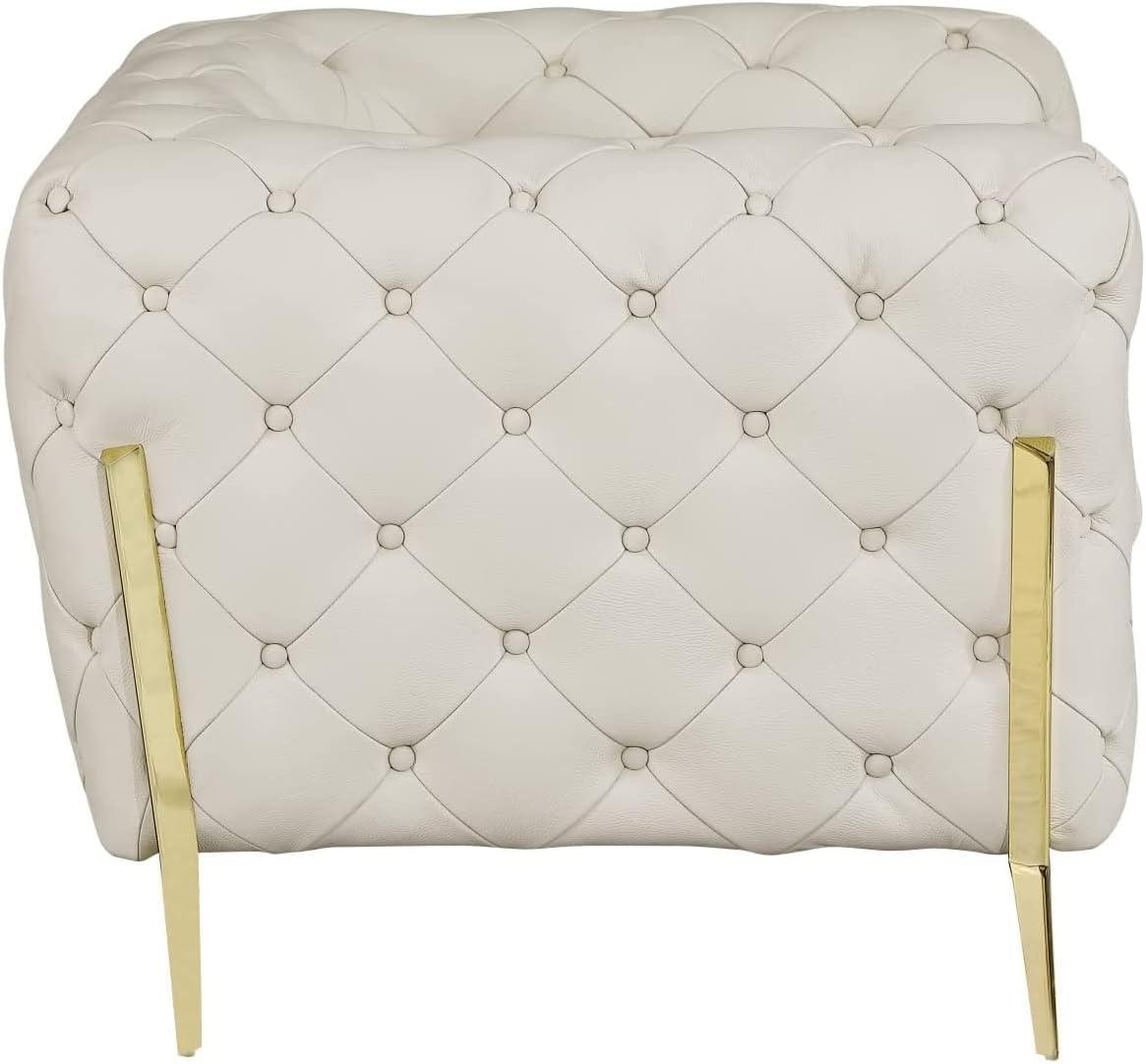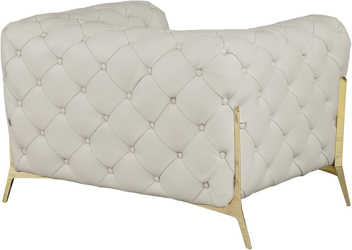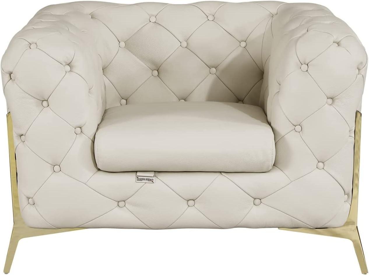 The deep button tufting on this set instantly elevates the aesthetic of any room, blending timeless sophistication with modern flair. Each piece, from the sofa to the armchair, features meticulously crafted tufted seats that add texture and visual interest without compromising the sleek, contemporary silhouette. The tufting not only enhances the luxurious beige tone of the genuine Italian leather upholstery but also reinforces the structure, offering a plush, inviting surface that encourages relaxation.This attention to detail is evident in the graceful curves of the club chair design and the crisp lines framed by stainless steel legs, giving our space a refined yet welcoming feel.