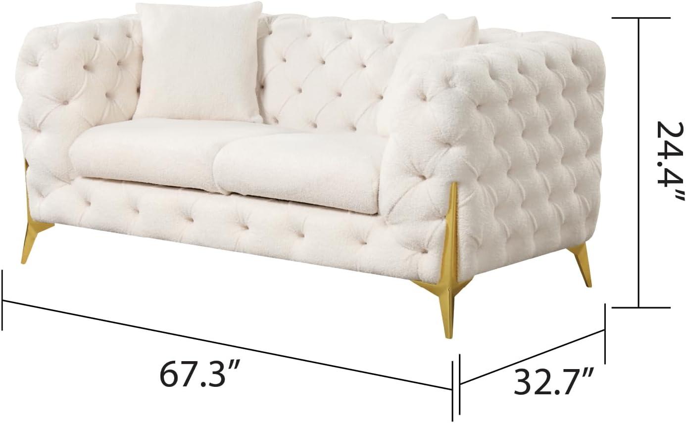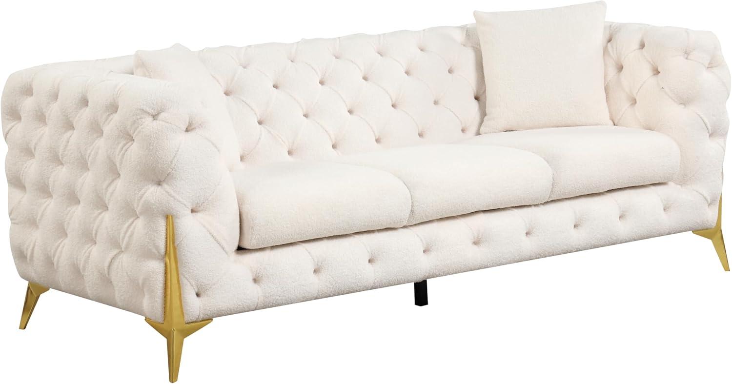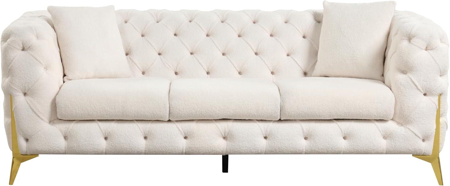 This living room ensemble effortlessly bridges the gap between modern elegance and cozy sophistication, making it a versatile addition to many decor themes. Its smooth cream upholstery paired with button-tufted backs and elegant buckle fabric details lends a refined touch that enhances minimalist and Scandinavian interiors alike. The subtle faux-fur pillows introduce a layer of texture, perfect for softening industrial or urban loft spaces, while the gold-plated stainless steel legs inject a hint of contemporary glamour that pairs beautifully with eclectic or mid-century modern furnishings.