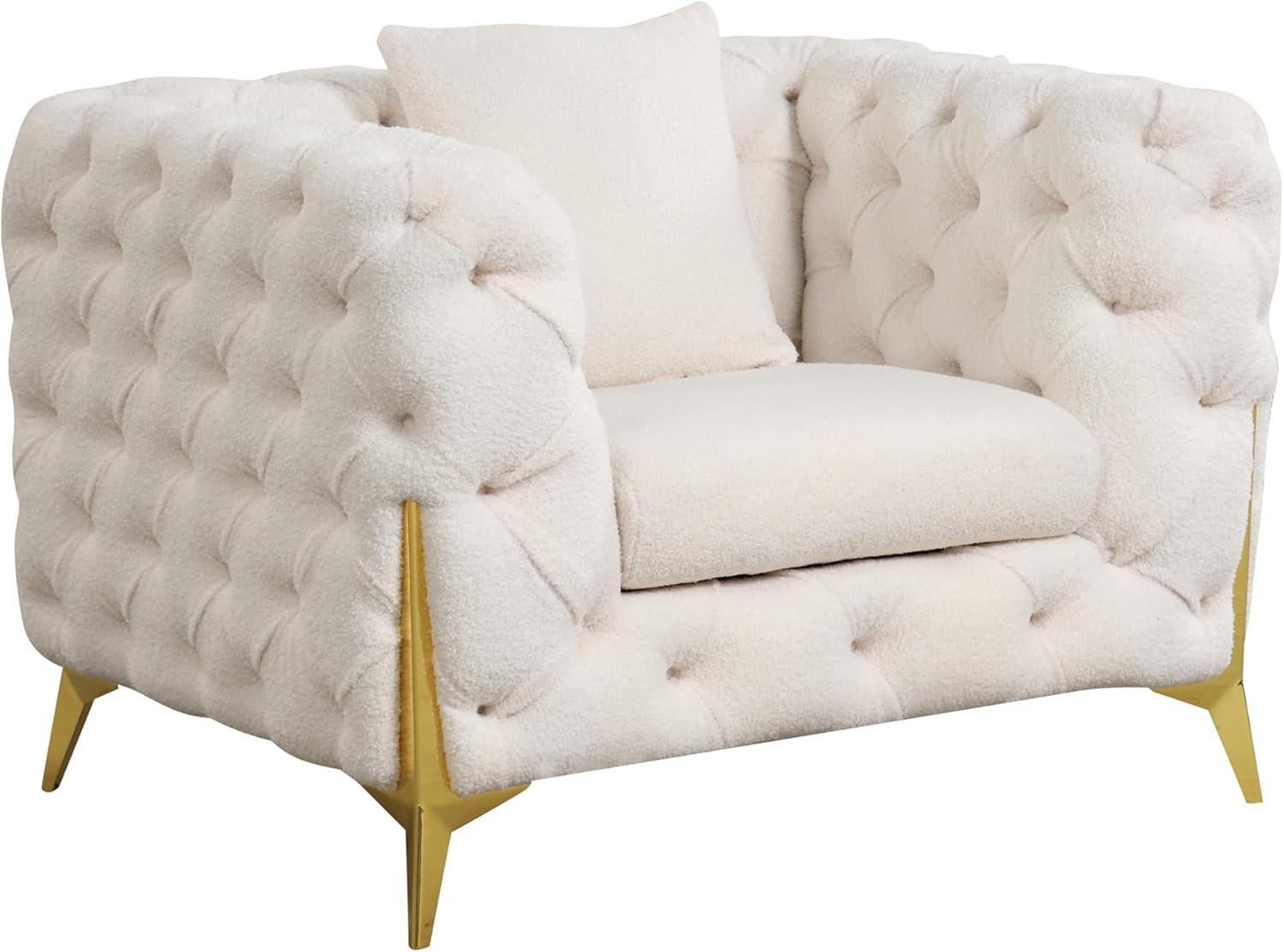 we appreciate how the set effortlessly brings together minimalism and luxury through its carefully chosen materials and details. Its cream upholstery, paired with elegant buckle fabric detailing and button-tufted backrests, offers a refined, timeless look that complements a variety of interiors. The contemporary gold-plated stainless steel legs not only provide excellent stability but also serve as a distinctive style statement,adding a subtle yet striking shimmer that lifts the entire ensemble.