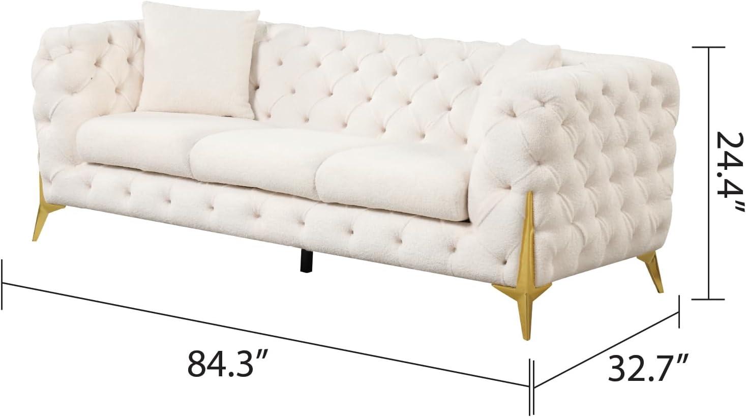 After spending time with this set, we can confidently say it strikes a balance between modern elegance and everyday comfort. The blend of cream upholstery with button-tufted backrests and elegant buckle fabric detailing creates a visually soothing yet stylish centerpiece for any living room. The gold-plated stainless steel legs not only elevate the look but also add stability, making each piece feel solid and durable. Plus, the high-density foam paired with spring support cushions provides a seating experience that’s as comfortable as it is supportive, while the included five faux-fur pillows add a luxurious touch that enhances relaxation and coziness.