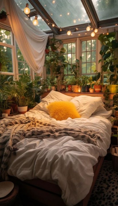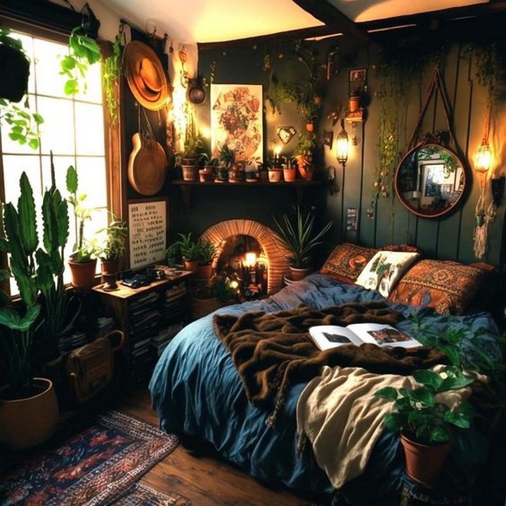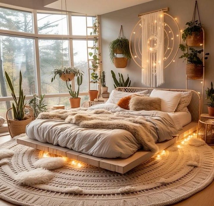 If your bed features a canopy, wrap soft string lights along the frame to amplify a dreamy, whimsical aura. Paired with flowing fabrics, this layering creates a serene retreat that’s quintessentially Bohemian.