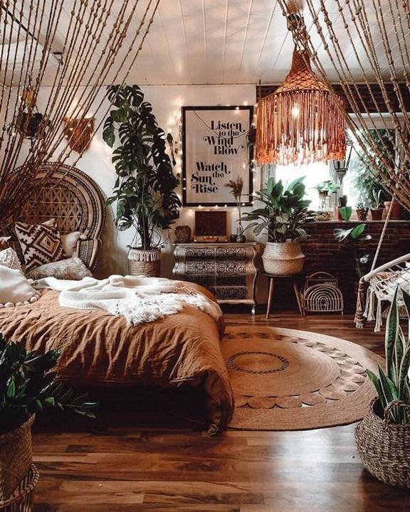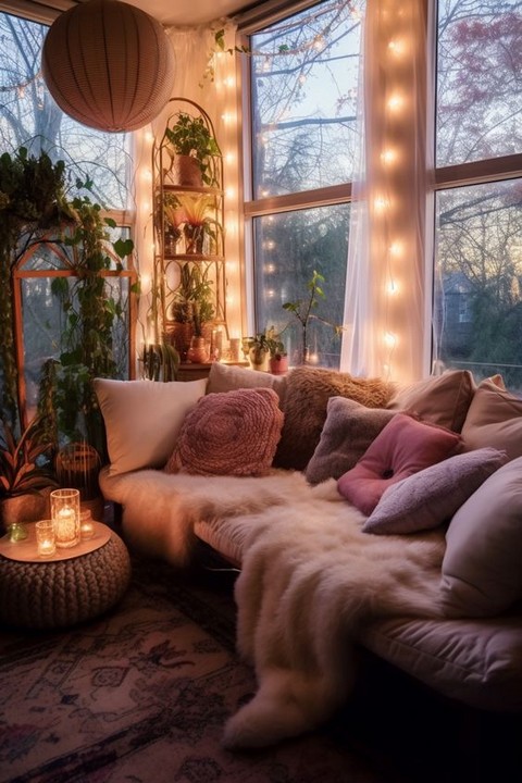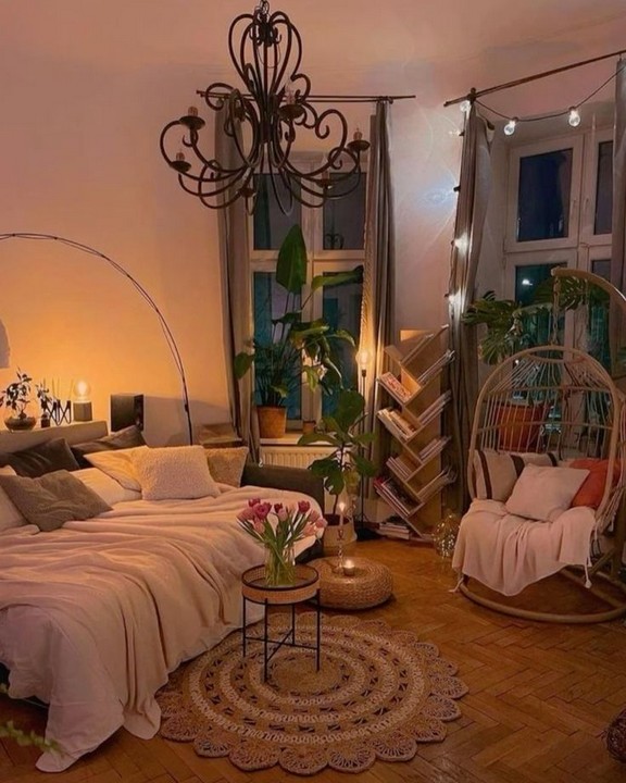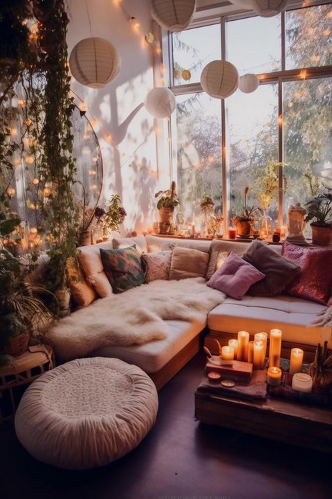 Enhance the space further by adding Boho-inspired wall hangings, such as woven tapestries, dreamcatchers, or macramé pieces. These elements bring texture and visual interest, harmonizing with your candlelight and lighting choices to complete the theme.