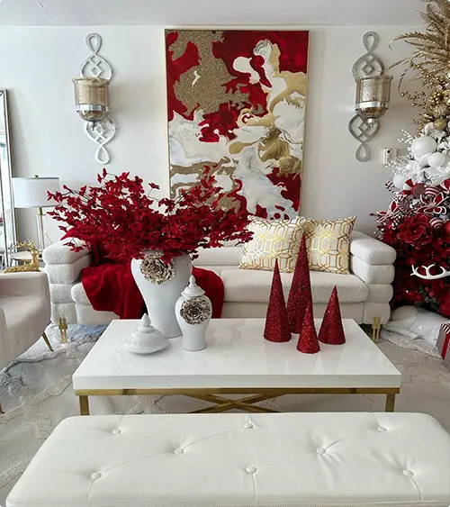 This space makes a striking statement with bold red branches in a white vase and glitter-embellished red mini trees on the coffee table. Gold highlights prevent the décor from tipping into kitsch, and modern art tying in the red tones adds cohesion and sophistication.