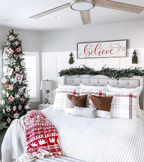 A simple “believe” sign sets a warm, inviting tone above the bed, complemented by a flocked Christmas tree nestled in the corner and plaid buffalo check cushions resting on the bedding. Above the headboard, a lush garland adds greenery without crowding the space, ideal for creating a cozy yet uncluttered room ambiance.