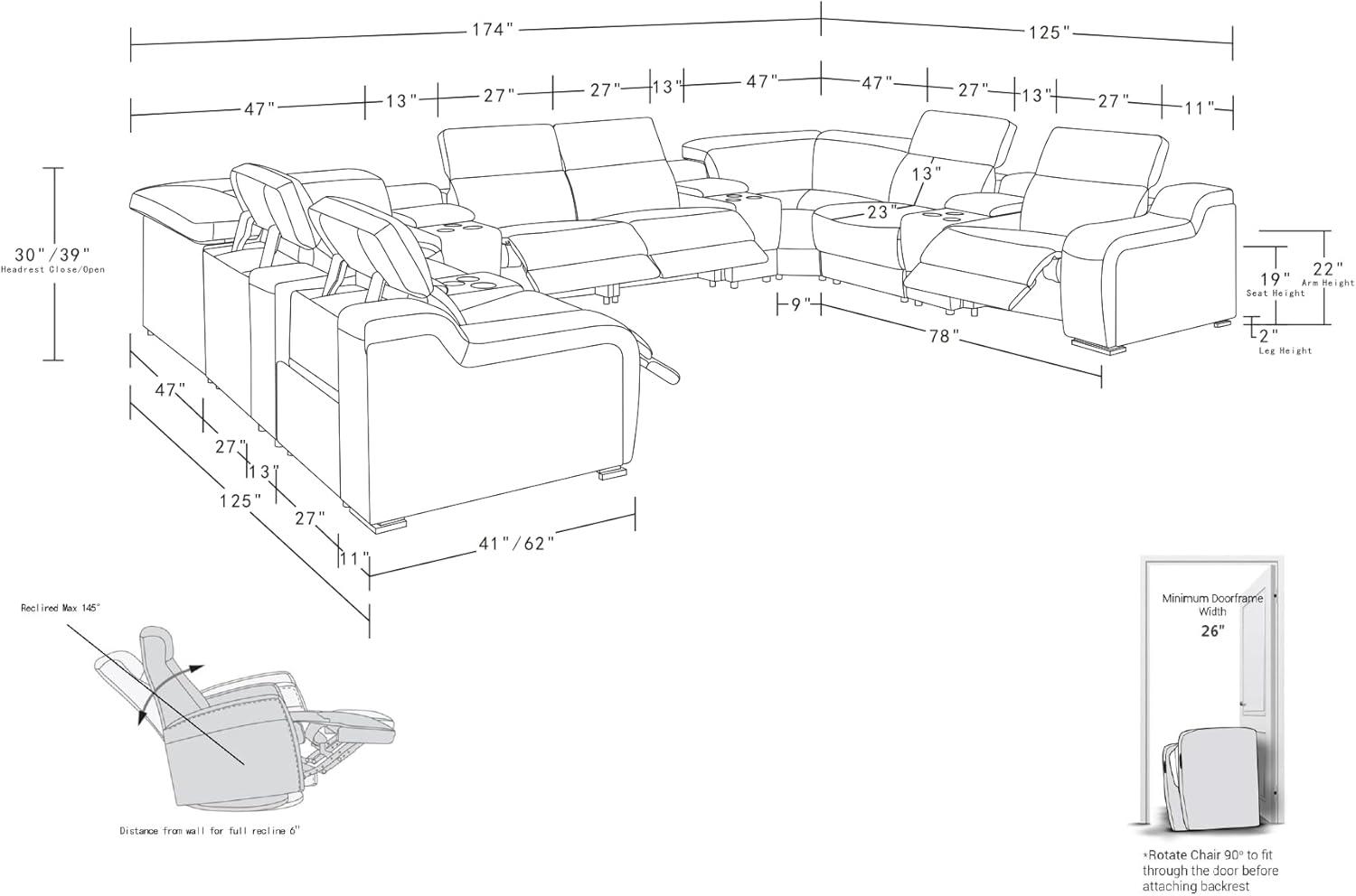 Comfort is expertly tailored with power-adjustable headrests that allow endless positioning for perfect neck and head support. Combined with four power recliners, each seat becomes a personal haven of relaxation.Amenities such as built-in wireless phone charging, dual USB ports, spacious console storage, and lumbar support elevate convenience and ease, delivering a truly immersive lounging experience. The robust Brazilian wood frame and stainless steel accents promise stability and style,ensuring your investment remains a centerpiece for years to come.