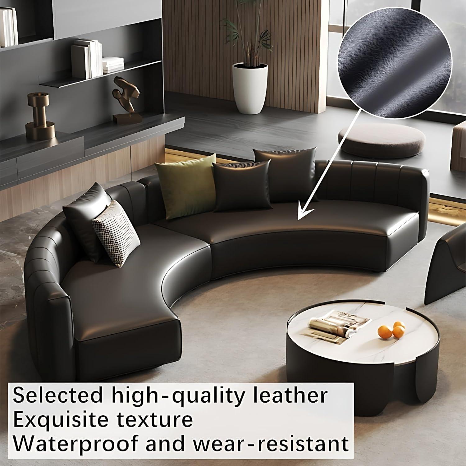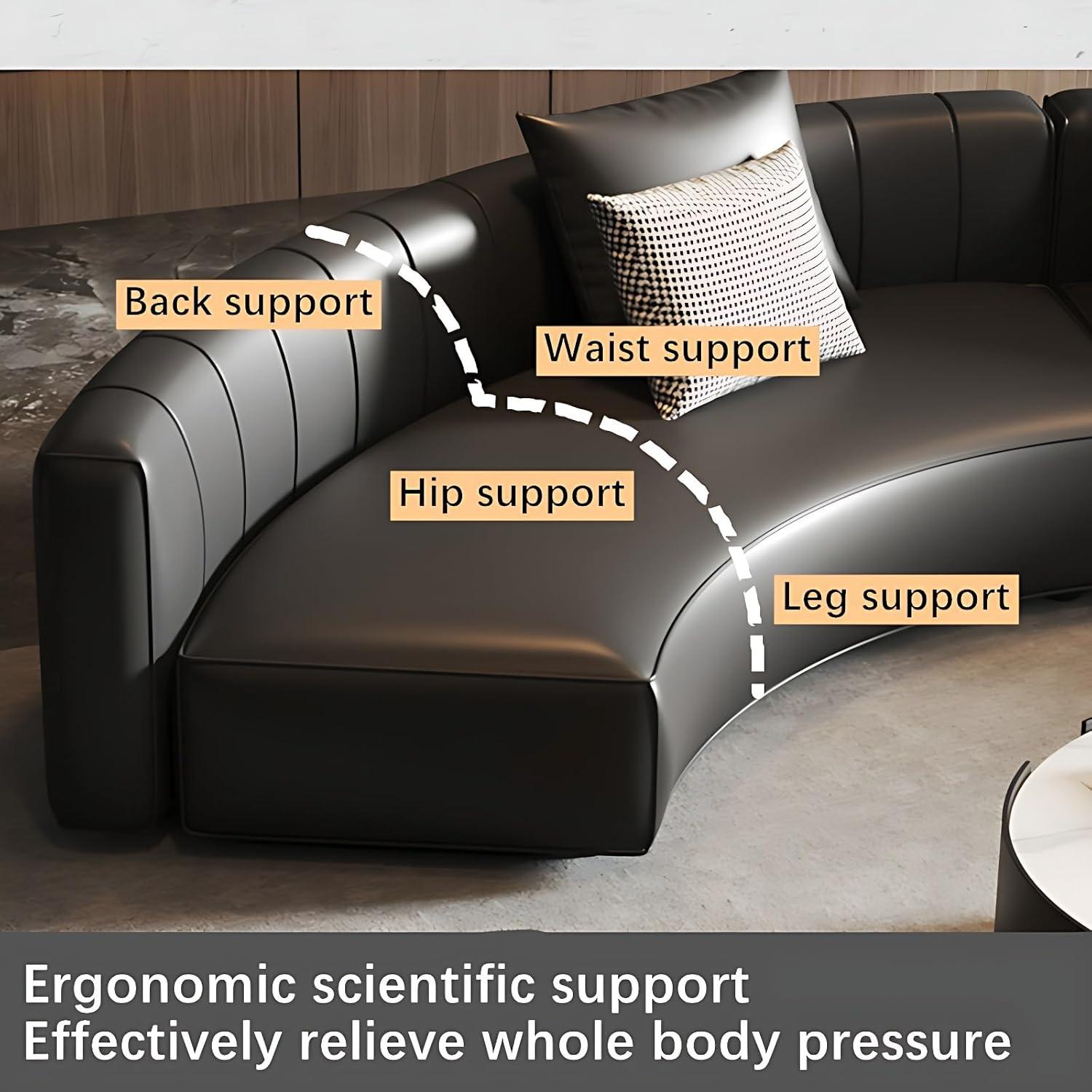 Designed with both style and comfort in mind, this sectional sofa excels in providing excellent support during extended periods of sitting. The semi-circular layout encourages natural seating positions, reducing strain on the back and hips. Each modular section is generously padded with high-density foam that maintains its shape over time, ensuring consistent lumbar support. The premium black leather upholstery not only adds a sophisticated look but also offers a smooth, cool surface that adapts well to various climates, enhancing overall comfort.