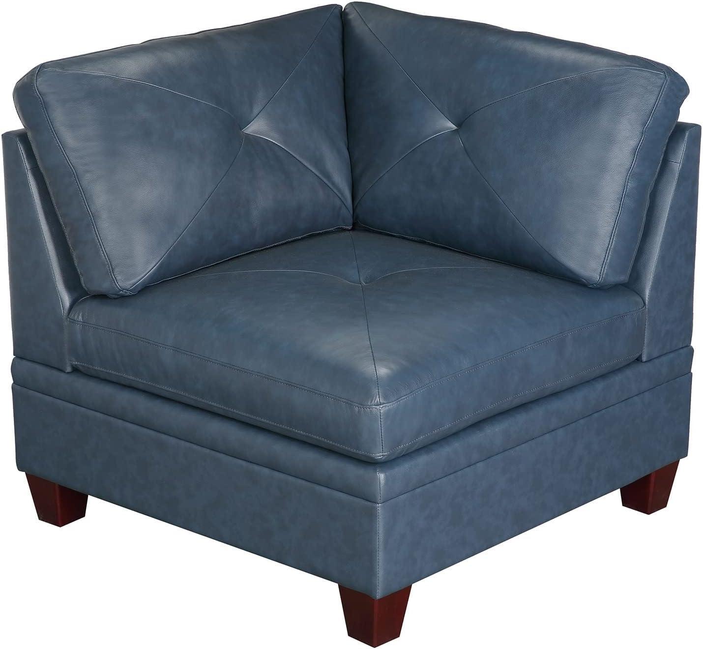 The design impresses right from the start with its contemporary aesthetic highlighted by the rich ink blue hue that effortlessly brightens any living space. Crafted with top grain genuine leather,the upholstery offers a smooth yet durable surface with a luxurious feel that softens over time without compromising its integrity. The tufted back design not only adds a visual texture but also delivers added comfort, creating an inviting seating experience. Each section, including the four corner wedges, armless chair, and ottoman, fits seamlessly together, allowing us to customize the layout according to our room’s dimensions and needs.