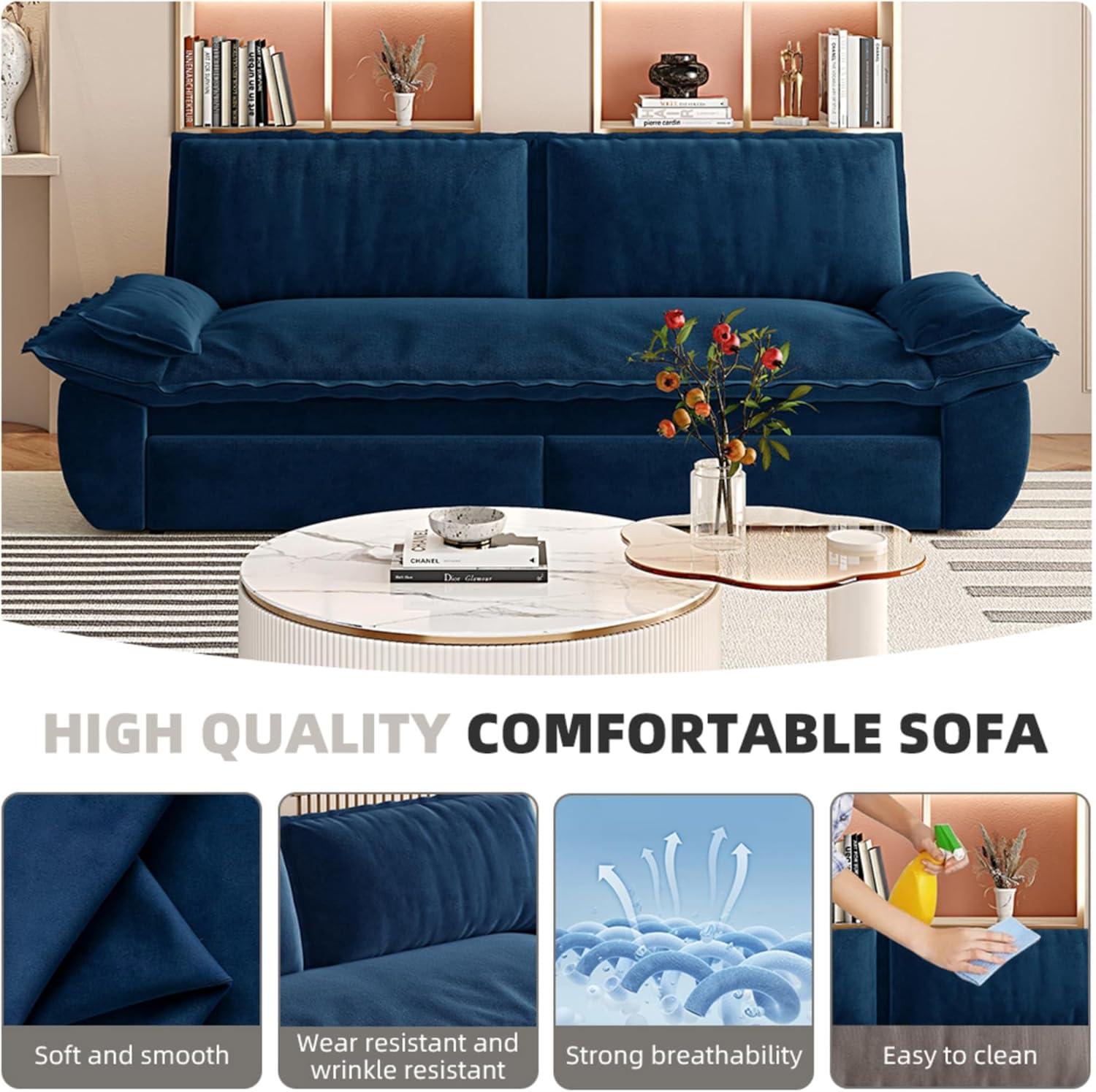 Using it daily has been a delight, thanks to its adaptable 3-in-1 design. It smoothly transitions from a loveseat to a chaise, and then fully extends into a queen-size bed without any fumbling. The plush velvet fabric paired with high-density sponge cushions offers cozy comfort whether sitting or lying down. We especially appreciated the backrest pillows’ generous 6-inch thickness,which give excellent support for lounging. This piece fits effortlessly in our living space, proving itself invaluable for both seating guests and providing a quality sleep option.