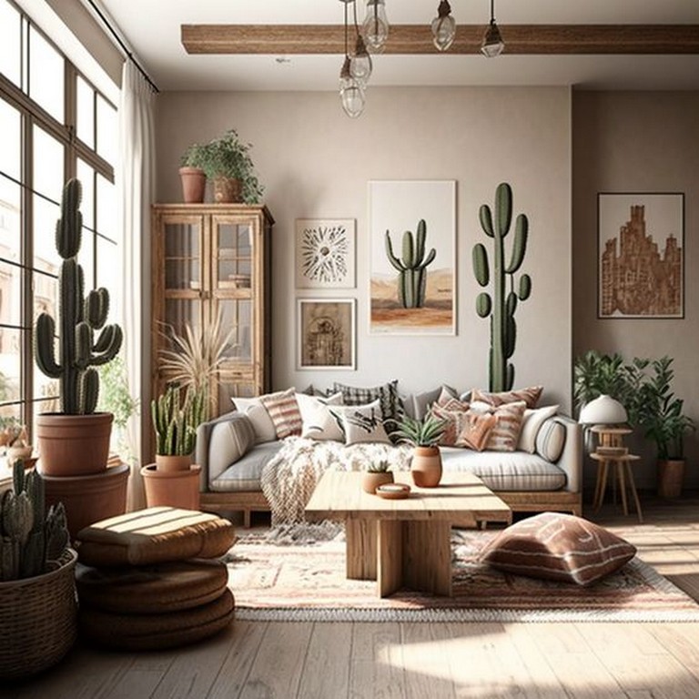 - Suggestions: Opt for a blend of greenery such as aloe vera, peace lilies, zz plants, or a sizeable monstera. Stylishly display them in artisan pottery on stands, shelves, or suspended containers to diversify your space’s look.