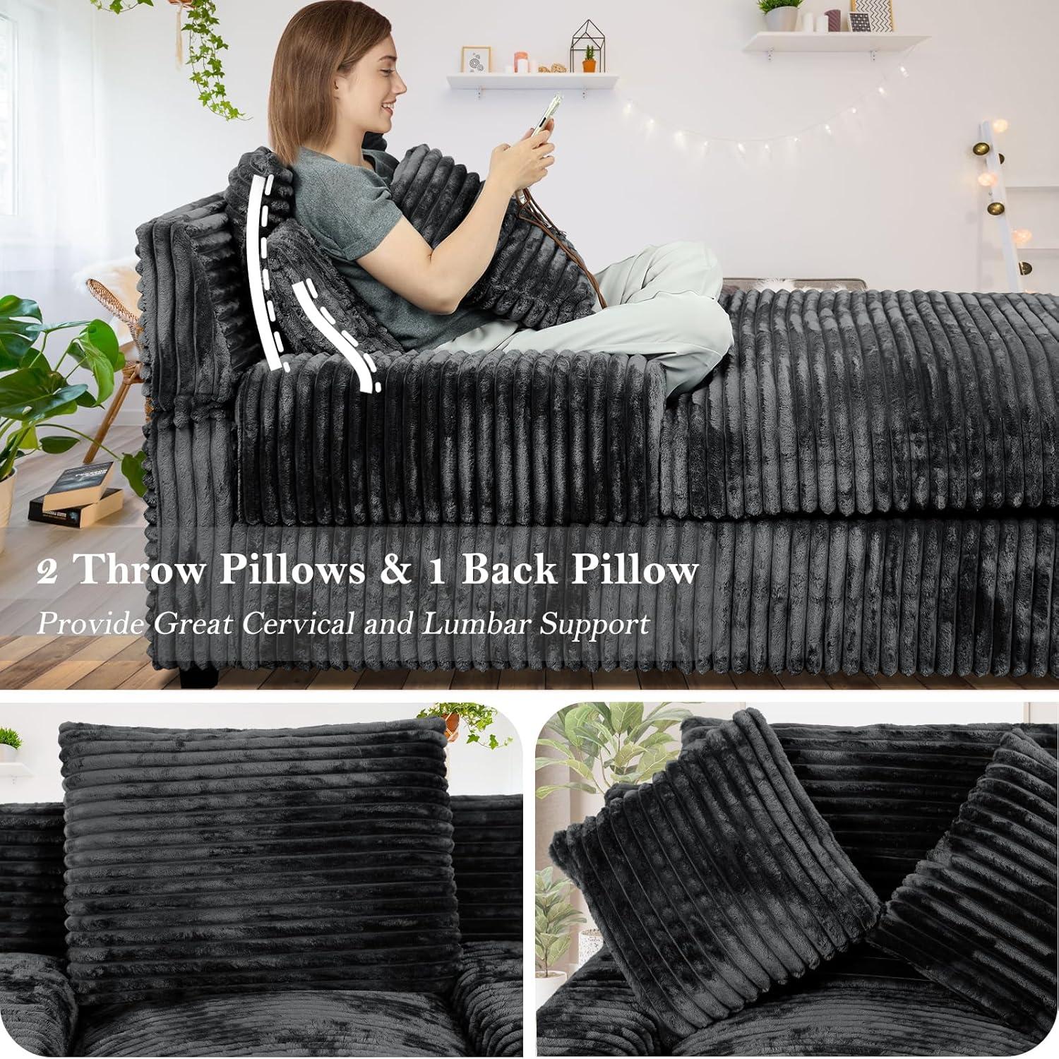 The upholstery features a soft, breathable corduroy fabric that adds both texture and modern charm to any living space. Its fabric not only feels inviting to the touch but also breathes well,ensuring comfort during extended lounging. We found the dark green and navy blue options particularly pleasing, as they lend a refined yet cozy vibe that easily complements a variety of room decors. The extra-wide seat and plush cushions, filled with high-density sponge and down cotton, create a support system that balances softness with durability. This upholstery holds its shape well, and the lumbar pillows nestled against the backrest enhance both support and style.