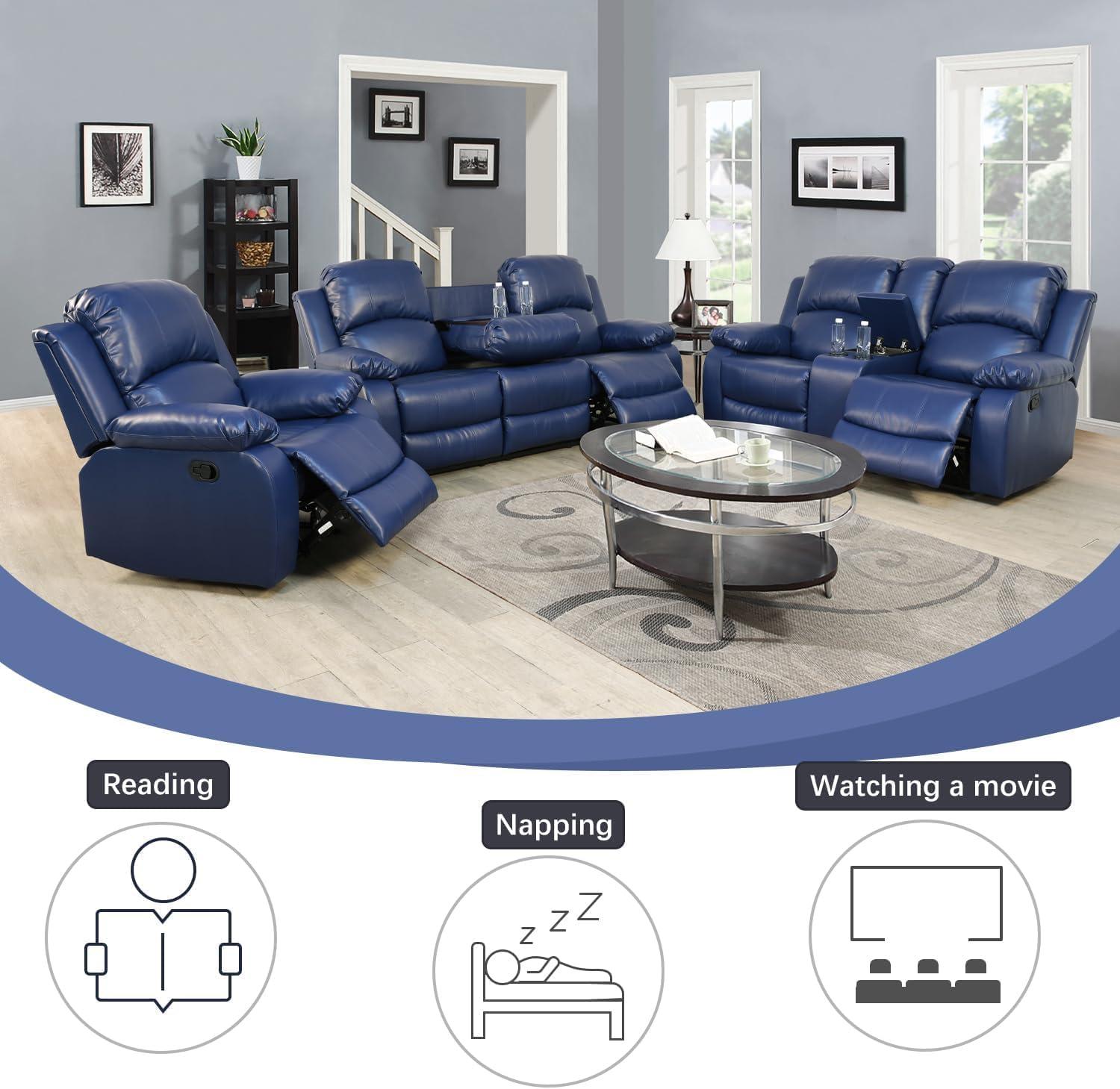 After exploring the Bonded Leather 3-Piece Sofa Set in all its comfort and style, we can confidently say it’s a versatile addition to any living space. From the rich blue bonded leather to the thoughtful manual recline, built-in storage, and convenient drop-down coffee tables, this set blends functionality with elegant design. Whether you’re settling in for a family movie night or simply unwinding with a good book, the plush cushions and adaptable reclining angles make relaxation effortless. Its classic yet contemporary aesthetic allows it to complement a variety of décors,making it a smart choice for many homes.
