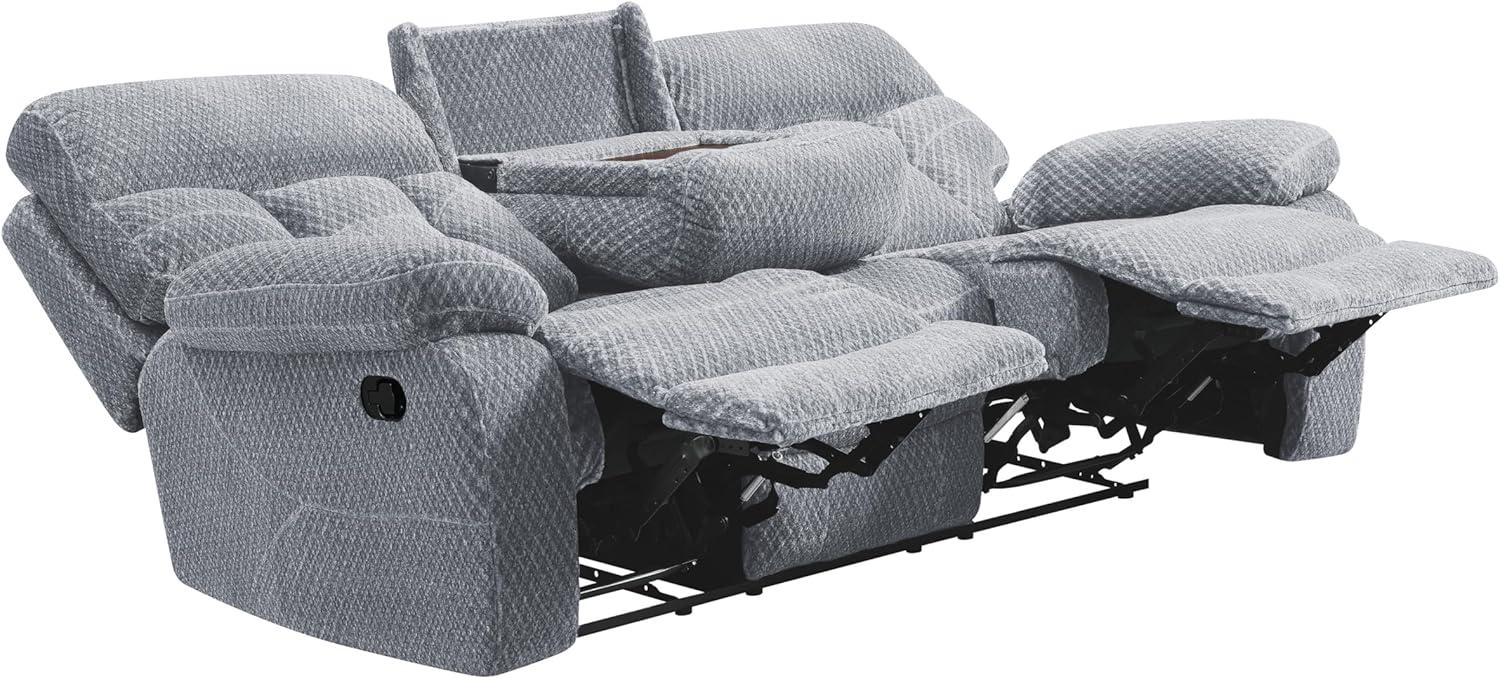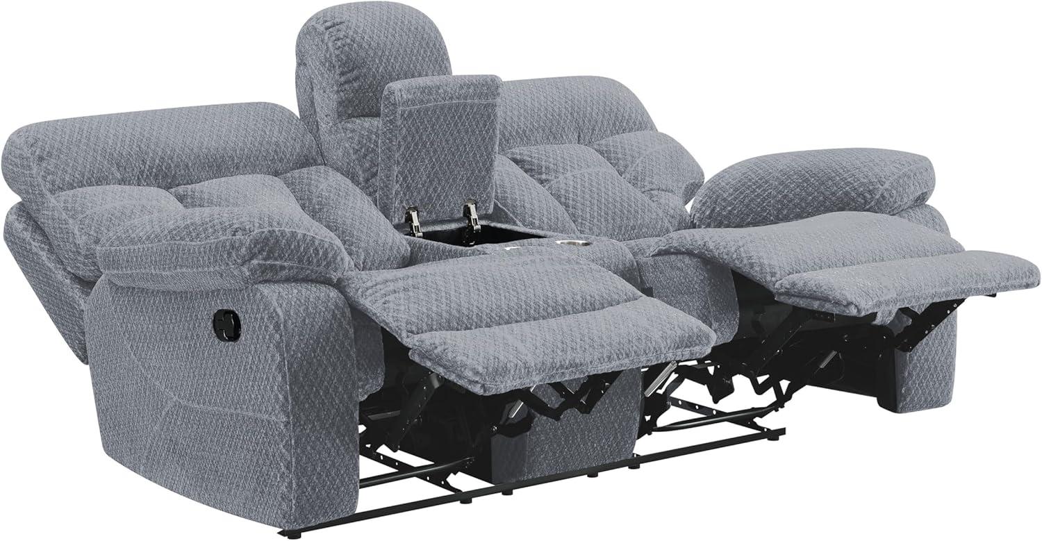 From the moment we settled into this living room set, it was clear that comfort meets thoughtful design.The plush, channel-back cushions combined with the pillowed arms and headrests create an inviting atmosphere that encourages relaxation after a long day. The reclining sofa’s chaise footrests provide excellent support, making it easy to stretch out fully, while the loveseat’s built-in console with cupholders and storage cubby adds a functional touch that keeps essentials within easy reach. Upholstered in a soft, stone-gray polyester fabric, the pieces are both stylish and practical, resisting stains and wear with minimal effort. The solid hardwood and manufactured wood frame construction inspires confidence in its durability, while the no-sag seat suspension ensures lasting comfort.
