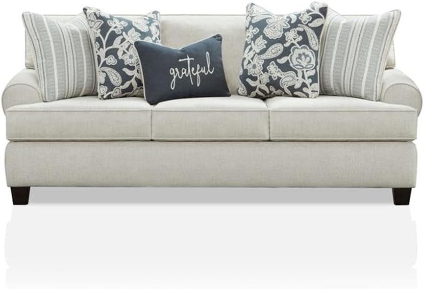 We find the overall aesthetic of this living room set to be a stunning blend of classic and contemporary design elements. The transitional style allows the pieces to fit seamlessly into various decor themes, creating a versatile foundation for any lounge area. The ivory chenille upholstery not only adds a soft, luxurious texture but also imparts a clean and refreshing visual that brightens the space.Complementing this neutral canvas are the patterned accent pillows in shades of navy blue and gray, which introduce subtle pops of color without overwhelming the eye. Rolled arms and tapered solid wood legs contribute to a cozy yet refined silhouette,inviting relaxation while maintaining an elegant look.