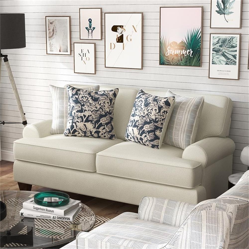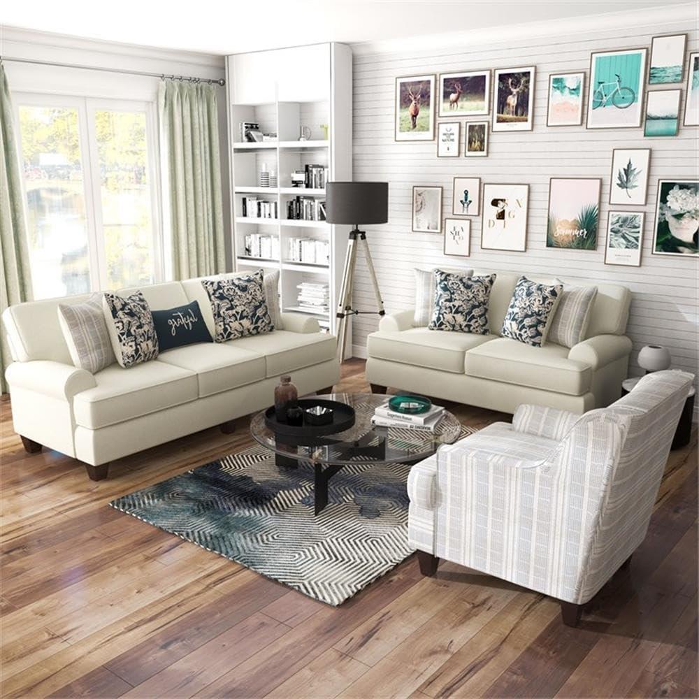 We find this sofa set to be a beautiful blend of comfort and style, perfect for those who appreciate a cozy yet refined living room aesthetic.The ivory chenille upholstery paired with patterned pillows in navy and gray adds subtle elegance without overwhelming the space. its transitional design with rolled arms and tapered wooden legs fits seamlessly into both modern and traditional interiors. If you’re looking for a versatile seating solution that melds charm with durability, this set delivers well, especially considering the solid wood frame and carefully cushioned seats that promise lasting support.