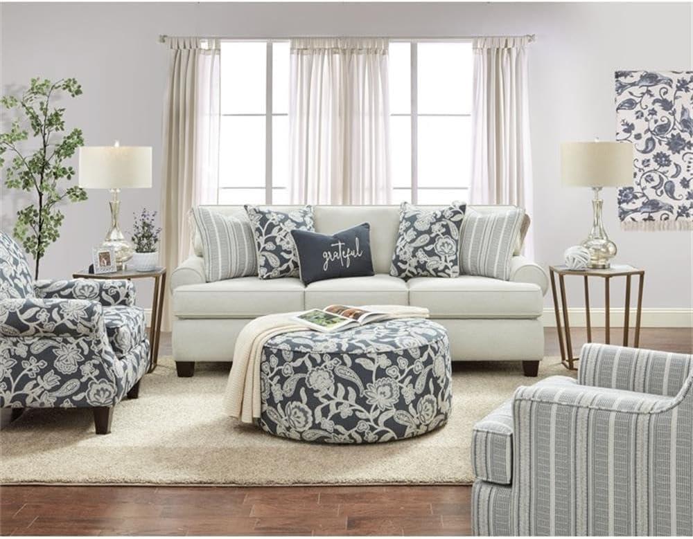 This set truly defines what it means to combine comfort with style. Designed in a transitional style, it features beloved rolled arms and tapered legs that bring both elegance and coziness into our living space. The neutral ivory chenille upholstery acts as an ideal backdrop, enriching the ambiance without overpowering it. What stands out are the patterned accent pillows in delicate navy blue and gray tones that add thoughtful pops of color. They perfectly complement the charming striped armchair, making the entire set feel warm and inviting. From plush cushioning to the subtle but distinctive silhouettes, every piece encourages us to sink in and relax after a long day.