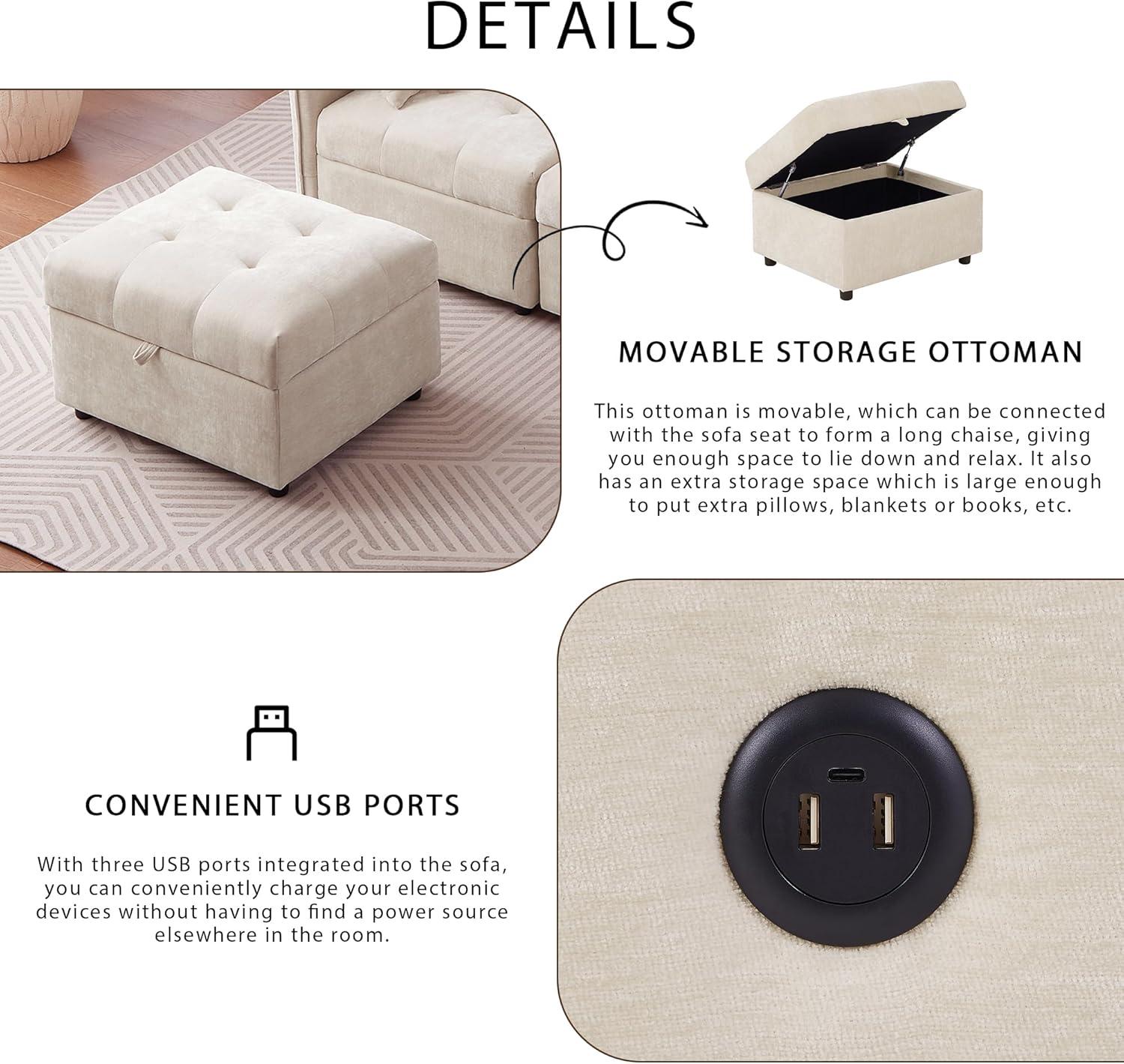 After spending considerable time exploring this sectional sofa, we appreciate how its modular design offers unmatched flexibility.the ability to rearrange the pieces to fit various spaces makes it a solid choice for apartments, offices, or living rooms where adaptability is key. The movable ottoman doubles as a chaise lounge and provides convenient hidden storage, which helps keep our space tidy and organized. Additionally, the plush chenille upholstery combined with foam and sinuous spring seating ensures a comfortable experience without sacrificing style. The integrated three USB ports prove to be a thoughtful modern touch, allowing us to stay connected and charged without cluttering the space with cords.